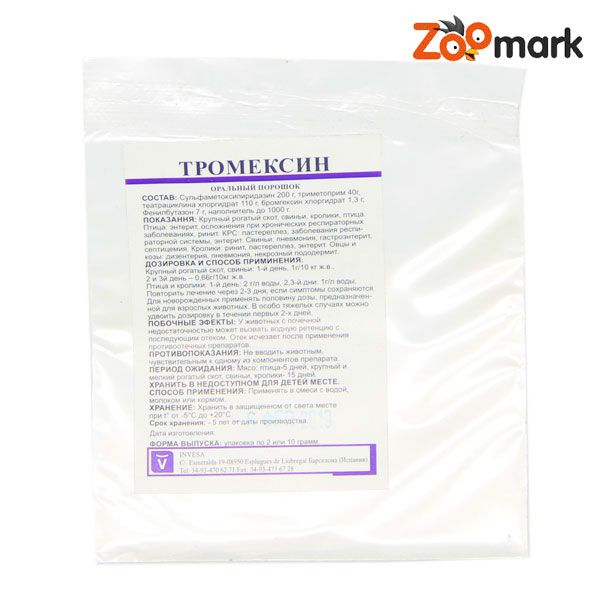 ІНСТРУКЦІЯ по застосуванню Тромексина порошку (Tromexin)ДозуванняПерорально з водою, молоком або кормом у дозі:велика рогата худоба і свині - 3 г препарату на 30 кг маси тіла на добу, і 2 г препарату на 30 кг маси тіла на наступну добу, а також 1-2 добу після зникнення симптомів або 1 кг препарату на 2000 літрів води або на 1000 кг корму. У важких випадках застосовується подвійна доза у перші два дні лікування.домашня птиця - 2 г препарату на літр питної води у першу добу, 1 г препарату на літр питної води на другу і третю добу, можна повторити на третю та четверту добу, якщо симптоми не проходять. Для новонароджених тварин застосовується половина дози.Опис: Комплексний антибактеріальний препарат в 1 грамі міститься в якості діючих речовин 200 мг сульфаметоксипиридазина, 40 мг триметоприму, 110 мг тетрацикліну хлоргідрату, 0,13 мг бромгексину хлоргідрату. За зовнішнім виглядом являє собою порошок світло-жовтого кольору.Фармакологічна дія:Дія тетрацикліну полягає в порушенні білкового синтезу бактерії на рівні рибосом. Механізм дії бромгексину полягає в гідролізі мукопротеинов, основних складових секрету дихальних шляхів. Бромгексин сприяє зняттю гіперемії слизових оболонок і поліпшенню вентиляції легенів. Тромексин ефективний при інфекціях, викликаних: E. coli, Clostridium spp., Salmonella spp., Proteus mirabilis, Proteus spp., Pasteurella spp., Staphylococcus, Streptococcus, Enterococcus, Klebsiella spp., Bordetella spp.,Neisseria spp. Терапевтична концентрація досягається в крові через 1 2 години після орального прийому тромексина і утримується протягом 12 годин. Максимальна концентрація в крові досягається через 8 годин після введення. Діючі речовини тромексина та їх метаболіти виводяться з організму переважно з сечею і жовчю.Показання: Птиці при ентеритах бактеріальної етіології, сальмонельозі, колибактериозе, при бактеріальних інфекціях на тлі вірусної патології великій рогатій худобі при пастерелезе, ентеритах, хворобах дихальних шляхів свиням при пневмонії, гастроентериті, септицемії вівцям і козам при дизентерії, пневмонії, копитної гнилі кроликам при гострому риніті, пастерелезе, ентеритах.Побічні дії:У рекомендованих дозах не впливає. При передозуванні препарату відзначається анемичность слизових оболонок, подразнення слизової шлунково-кишкового тракту, погіршення функції нирок.Протипоказання: Забороняється застосовувати курам-несучкам. Не рекомендується застосовувати тваринам, гиперчувствительним до одного з компонентів препарату, а також з нирковою недостатністю.Виробник: ІНВЕС (INVESA), Іспанія.