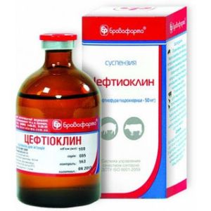 Склад1 мл препарату містить:цефтиофура гідрохлорид 50 мгОписРідина світло-жовтого або світло-коричневого кольору, однорідна.Фармакологічні властивостіЦефтиофура гідрохлорид антибіотик ІІІ покоління групи цефалоспоринів з широким спектром антибактеріальної дії. Механізм дії полягає в пригніченні синтезу клітинної стінки бактерій.СвідченняЛікування тварин при захворюваннях, викликаних грампозитивними і грамнегативними мікроорганізмами, включаючи види, що продукують бета-лактамазу, Escherichia coli, Pasteurella haemolytica, Pasteurella multocida, Haemophilus somnus, Actinobacillus pleuropneumoniae, Haemophilus parasuis, Salmonella cholerasuis, Streptococcus suis, Streptococcus zooepidemicus, Pasteurella spp ., Staphylococcus spp., Actynomyces pyogenes, Salmonella typhimurium, Streptococcus agalactiae, S. dysgalactiae, S. bovis, Klebsiella spp., Citrobacter spp., Enterobacter spp., Bacillus spp., Proteus spp., Fusobacterium necrophorum, Porphiromonas assacharolytica (Bacteroides melaninogenicus): велика рогата худоба післяпологовий ендометрит, некробактеріоз, захворювання органів дихання свині захворювання органів дихання.ПротипоказанняНе призначати тваринам з підвищеною чутливістю до цефтиофуру та інших бета-лактамних антибіотиків.Спосіб застосування та дозиПеред застосуванням суспензію збовтують і вводять: велика рогата худоба підшкірно або внутрішньомязово, 1 раз на добу, в дозі 1 мл на 50 кг маси тіла (1 мг цефтиофура гідрохлориду на 1 кг маси тіла), курс лікування при захворюваннях органів дихання 3-5 днів, при некробактериозе мінімум 3 дні, при ендометриті 5 днів свині внутрішньомязово, 1 раз на добу, в дозі 1 мл на 16 кг маси тіла (3 мг цефтиофура гідрохлориду на 1 кг маси тіла), курс 3-4 дні.ЗастереженняНе змішувати з іншими препаратами в одному шприці.Після останнього застосування препарату забій великої рогатої худоби на мясо дозволяється через 8 діб, свиней через 5 діб. Мясо, отримане раніше зазначеного терміну, утилізують або згодовують непродуктивним тваринам, залежно від висновку ветеринарного лікаря. Період виведення молока відсутня.Умови зберіганняВ сухому, темному, недоступному для дітей місці при температурі від +4 до +25 С.Після стерильного розкриття флакона препарат зберігати в холодильнику і використати протягом 15 діб.Термін придатності2 роки.