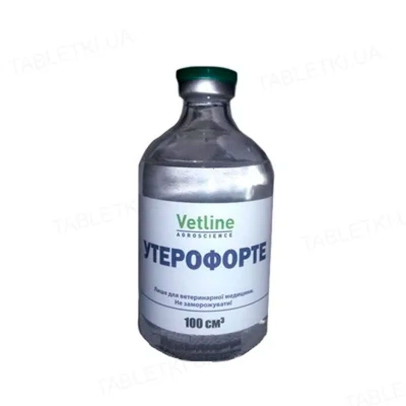 Склад:бета-аденоблокатор, формалін і вода дистильована.Фармацевтична форма:Безбарвна прозора рідина без запаху. Рідина не повинна мати сторонніх домішок.Фармакологічні властивості:Викликає блокуючу дію на бета-аденорецептори міометрія.Механізм дії препарату Утерофорте по стимуляції і нормалізації статевої функції тварин полягає в оптимізації нервової трофіки і поліпшення центральної регуляції статевої циклічності шляхом посилення кровообігу та інтенсифікації обміну речовин.Вид тварин:ВРХ.Показання:препарат призначений для стимуляції статевої функції тварин.Спосіб застосування:Утерофорте застосовують підшкірно або внутрішньомязово.Дозування:для стимуляції і нормалізації статевої функції (при гіпофункції і гипоплязии яєчників, анафродизии, неповноцінних статевих циклах) курсом три інєкції, через 48 годин у дозах 10 см3при слабких сутичках і потугах, затримання посліду - через кожні 2-4 години в дозах 10 см3для лікування метриту - двічі в добу, вранці і ввечері до одужання в дозах 10 см3у ранній післяпологовий період (до 10 доби після отелення) з метою медикаментозної профілактики безпліддя та попередження порушень статевої функції - щодня в дозах 5 см3або через день в дозах 10 см3при слабких сутичках і потугах та в інших випадках у дозі 5-10 см3через 1,5-2 години 2-3 рази на добу.Протипоказання:Не слід застосовувати препарат вагітним, хворим серцево-судинними захворюваннями тварин.Застереження при застосуванні:Шприци та голки стерилізують кипятінням. Поверхня шкіри на місці введення вакцини дезінфікують 70 етиловим спиртом.При введенні щеплень дотримуються загальних правил асептики і антисептики.Взаємодія з іншими засобами:не встановлені.Особливі вказівки:Перед використанням флакони з препаратом Утерофорте досліджують на цілісність, наявність сторонніх домішок, пластівців.Побічні ефекти:при використанні препарату згідно з листівкою вкладки препарат не шкідливий.Термін придатності:12 місяцівУмови зберігання:у сухому темному місті при температурі від +5С до +25С.