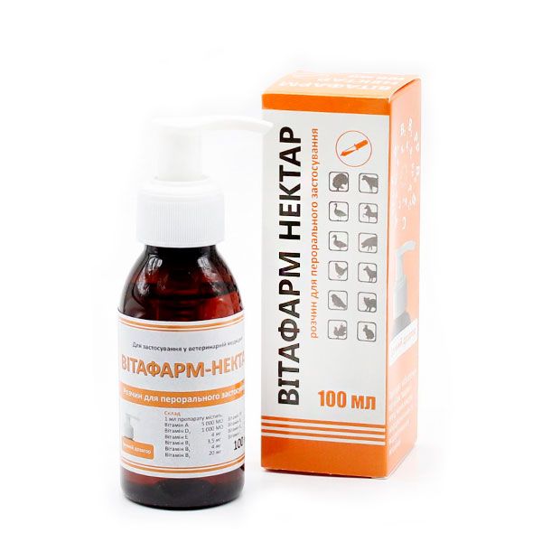 Опис:Прозора від жовтого до світло-коричневого кольору рідина, можлива опалесценція.Склад:1 мл препарату містить діючі речовини:вітамін А - 5000 МОвітамін D3 - 1000 МОвітамін E - 4 мгвітамін В1 - 3,5 мгвітамін В2 - 4 мгвітамін В3 - 20 мгвітамін РР - 15 мгвітамін В6 - 2 мгвітамін В12 - 10 мкгвітамін С - 25 мг.Допоміжні речовини: спирт етиловий, твін-80, антранцин 55, вода для інєкцій до 1 мл.Фармакологiчнi властивостi:Властивості препарату зумовлені наявністю жиророзчинних та водорозчинних вітамінів.Вітамін А сприяє росту та регенерації клітин різних тканин, активізує функціонування печінки, шкіри та сітківки ока.Вітамін Д3 впливає на засвоєння та регулювання обміну кальцію та фосфору, необхідних для росту і збереження структури кісток утворення яєчної шкаралупи.Вітамін Е виконує роль антиоксиданту: захищає від окиснення ліпіди та інші речовини при патологічних процесах, бере участь в біосинтезі білка та проліферації клітин, стабілізації клітинних мембран, регулюванні статевої функції.Комплекс вітамінів групи В сприяє функціонуванню нервової системи, регулює метаболізм білків, жирів і вуглеводів, окисно-відновні реакції, бере участь у процесі зсідання крові запобігає анемії.Вітамін С регулює процеси вуглеводневого обміну, зсідання крові, регенерації тканин, бере участь у синтезі колагену, утворенні стероїдних гормонів.Застосування:Профілактика і лікування у папуг, канарок, хомяків, морських свинок і шиншил, дефіциту жиророзчинних та водорозчинних вітамінів (гіповітамінозу) підвищення резистентності організму, нормалізації обміну речовин в організмі тварин і птахів, зниження негативної дії у стресових ситуаціях при транспортуванні, при несприятливих умовах (холод, перегрівання), при незбалансованій годівлі, при захворюваннях, що супроводжуються анорексією.Застосовують, як підтримуючу терапію при лікуванні мікотоксикозів.Дозування:При ліуванні препарат задають орально з питною водою або кормом у дозі:з питною водою - 1-2 млл (2-5 крапель50 мл)добуз кормом - 1,5 млкг (3 краплі50 г)добу.Одне натискання на важіль дозатора і 30 крапель через піпетку відповідає 1 мл препарату. Препарат можна також дозувати шприцом-дозатором.З метою профілактики препарат застосовують протягом 5-7 діб, через 7-10 діб препарат застосовують повторно.Як підтримуюча терапія дозування збільшують у 2 рази і задають добавку до одужання.Протипоказання:НемаєЗастереження:Не застосовувати тваринам та птахам, які отримують корми, збалансовані за вітамінами.Форма випуску:Флакони із скла по 10 мл, закриті гумовим корком під алюмінієву обкатку з піпеткою-крапельницею, флакони із скла по 25 мл, закриті гумовим корком під алюмінієву обкатку з шприцом-дозатором, полімерні флакони по 10 мл з вставкою-піпеткою та кришкою з контролем відкриття, полімерні флакони по 100 мл, закриті дозаторами натискного типу, вкладені у індивідуальні коробки, полімерні каністри про 1000 мл, закриті кришками з контролем відкриття.Зберiгання:2 роки.Після розкриття флакона термін придатності становить 10 діб у темному, прохолодному місці після розинення у воді 24 години.