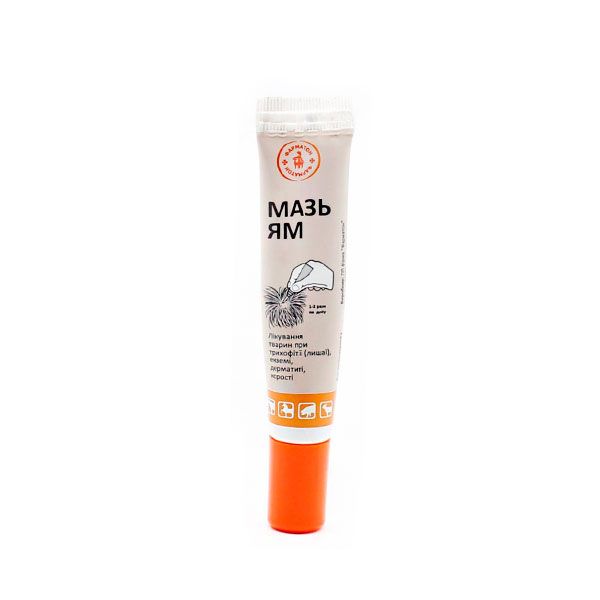 МазьЯМлистівка-вкладкаОписМазь від сірого до сіро-коричневого або коричневого кольору із специфічним запахом.Склад1 г препарату містить діючі речовини:кислоту саліцилову 30 мгсірку 100 мгцинку оксид 100 мгдьоготь березовий .80 мгскипидар живичний 10 мг.Допоміжні речовини: ланолін безводний, емульгатор, вазелін.Фармакологічні властивостіATC vet QD10,ветеринарні препарати протимікробної дії (QD10Х30, різні комбінації препаратів)Мазь Ям має виражені фунгіцидні, бактерицидні та протипаразитарні властивості, які зумовлені синергічною дією речовин які входять до складу препарату.При нанесенні на шкіру мазь має подразнюючу, вяжучу, кератопластичну дії, прискорює процеси заживлення ран. Проникаючи у верхні шари шкіри, препарат знищує ектопаризитів по всій глибині шкіри.ЗастосуванняЛікування великої рогатої худоби, коней, овець, кіз, свиней, птиці, собак, кролів при захворюваннях шкіри (екземи, дерматити, трихофiтiя, короста, некробактеріоз копит, копитна гниль у овець).ДозуванняМазь наносять тонким шаром, злегка втираючи, на уражені ділянки шкіри i на 24 см навколо них без попереднього видалення лусочок i вистригання шерсті. Уражені ділянки обробляють 12 рази на добу до відокремлення лусочок. Якщо через 45 діб лусочки не відокремились, втирання мазі продовжують. Як правило через 710 діб уражені ділянки звільняються від лусочок i на них спостерігається ріст волосся. Через 10 діб після обробки з уражених ділянок шкіри проводять контрольні мiкроскопiчнi дослідження зiскобiв. При виявленні збудника хвороби лікування продовжують.ПротипоказанняПідвищена чутливість до компонентів препарату.Гострий перебіг захворювання (гнiйнi процеси)ЗастереженняПри індивідуальній чутливості тварин до складників препарату можливі подразнення шкіри.Не рекомендується застосовувати для лікування котів.Форма випускуПластикові контейнери 15, 50, 100, 200, 400 габо ламіновані тубипо 50 г.ЗберiганняСухе темне, недоступне для дітей місце при температурі від0 до 25 С.Термiн зберiгання 2роки.