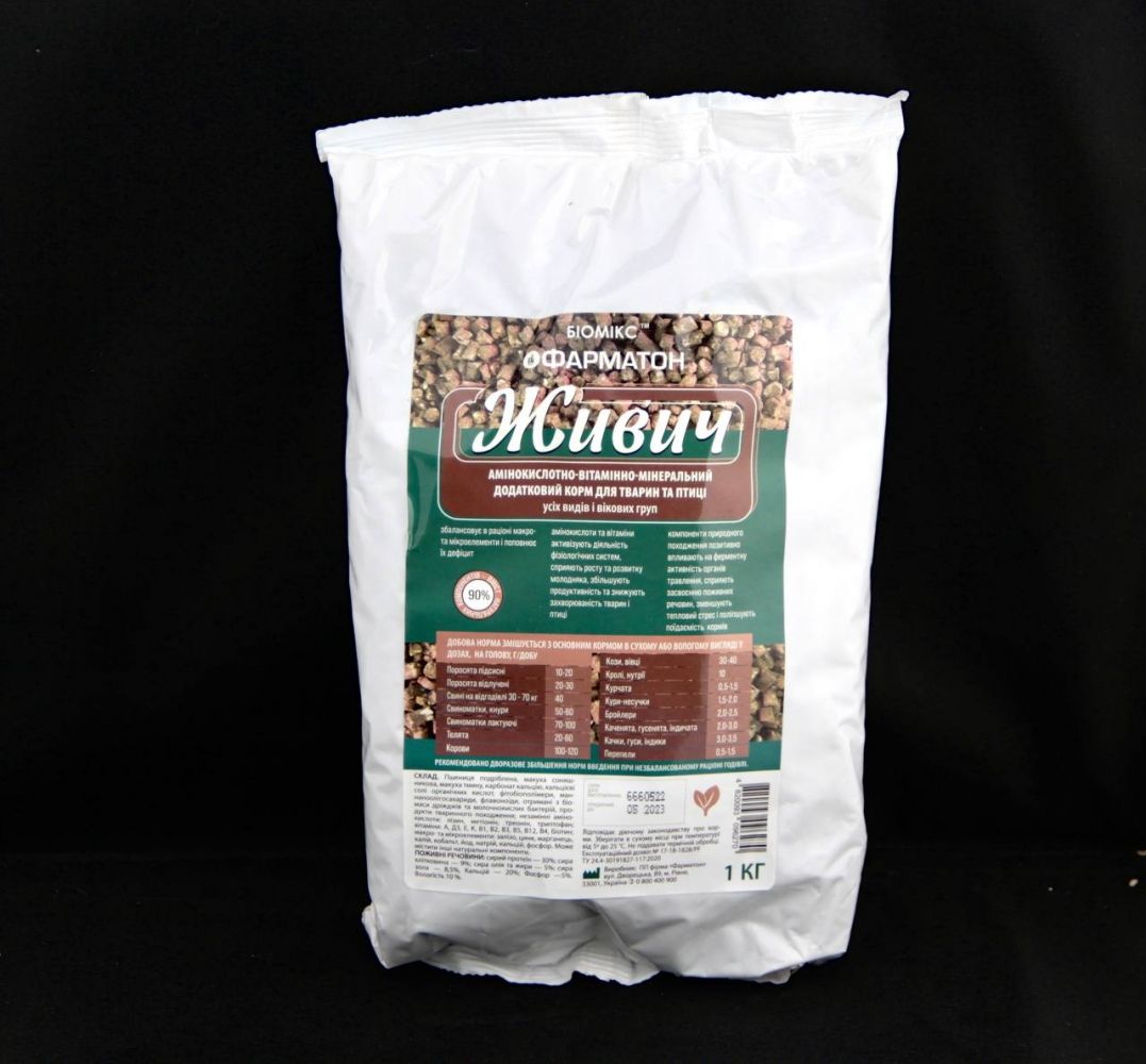 Биомикс живич фарматонАминокислотно витаминно-минеральний додатковий корм для тварин и птицивсих видив викових груп збалансує в рациони макро и микроелементи и поповнює їх дефицит 90 аминокислоти и витамини активизують дияльнисть физиологичних систем, сприяють росту и розвитку молодняку, збильшують продуктивнисть и зниження захворюванисть тварин и птици компоненти природного походження позитивно впливають на ферментну активнисть органив травлення, сприяють засвоєнню поживних речовин, що зменшують теплової стреси покращують поїдання кормив.Добова норма змишується з основним кормом в сухому або вологому вигляди в дозах, на голову:поросята пидсисни 10-20 г добупоросята видлучени 20-30 г добусвини на видгодивли 30 - 70 кг 40 г добусвиноматки, хряки 50-60 г добусвиноматки лактуючи 70-100 г добутелята 20-60 г добукорови 100-120 г добукози, вивци 30-40 г добукролики, нутриї 10 г добукурчата 0,5-1,5 г добукури-несучки 1,5-2,0 г добубройлери 2,0-2,5 г добукаченята, гусенята, индичата 2,0-3.0 г добукачки, гуси, индики 3.0-3,5 г добуперепели 0,5-1.5 г добуСкладПшениця дробленку, Макуха соняшнику, Макуха кмину, карбонат кальцию, кальциєви соли органичних кислот, фитобиополимери, флавоноїди, отримани з биомаси дрижджив и молочнокислих бактерий, продукти тваринного походження незаминни аминокислоти: лизин, метионин, треонин, триптофанвитамини: а, дз, е, к, в1, в2, в3, в5, в12, в4, биотинМакро и микроелементи: зализо, цинк, марганець, калий, кобальт, йод, натрий, кальций, фосфор. може мистити инши натуральни компоненти.Живильни речовинисирий протеїн-30 сираклитковина-9 сире масло и жири-5 сирезола-8,5, кальций-20 фосфор -5.вологисть 10.Рекомендовано дворазове збильшення норм введення при незбалансованому рациони годивли.Зберигати в сухому мисци при температуривид 5 до 25 С. не пиддавати термичний обробци,