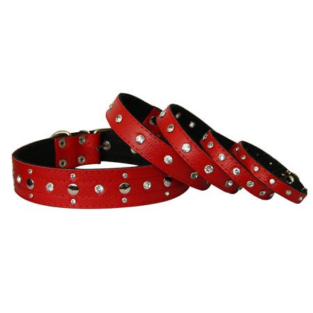 Нашийник для собак Шкіряний з алмазами, червоний 23-32 см