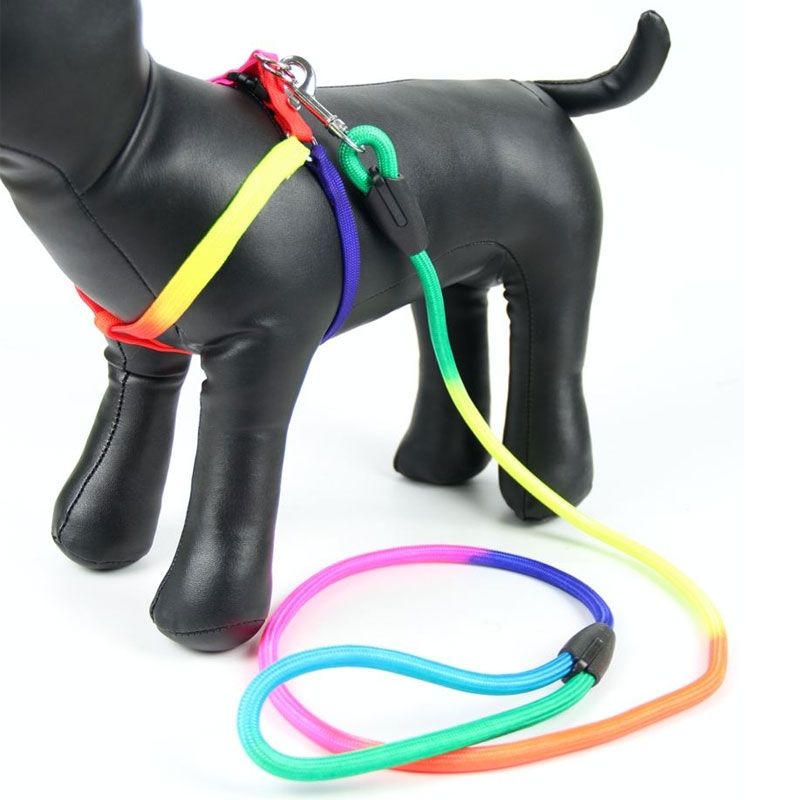 Яскравий комплект шлейки і повідця для собак забарвленням Веселка. Призначений для комфортних і веселих прогулянок з вашим вихованцем.комплект 1,512-15100 круглий шнур, ручка петля з кольором веселкиширина стрічки 1,5 см, шлея 24-30см