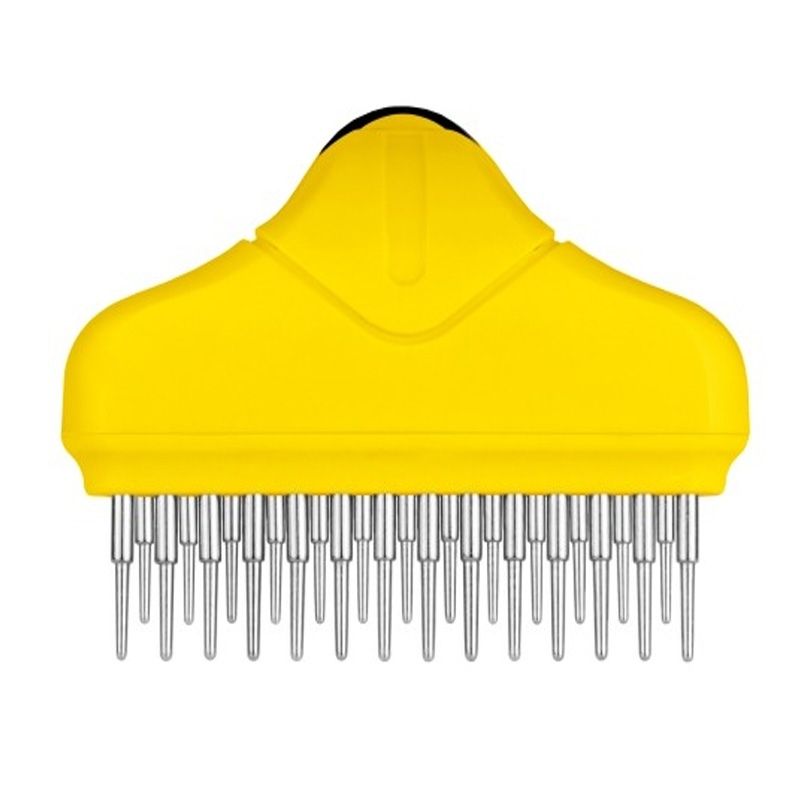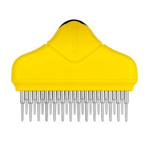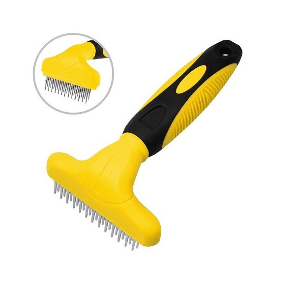 Опис гребінець граблі для тваринДворядна гребінець граблі Bronze dog для акуратного і інтенсивного розчісування шерсті і масажу шкірних покривів собаки. Робоча поверхня має два ряди обертових зубів.Крутиться конструкція дозволяє більш ніжно і акуратно розплутати довгу і середню шерсть, а також масажувати шкірні покриви. Завдяки круглій конусоподібній формі зубчиків волоски шерсті не висмикуються і розплутуються дуже акуратно, а закруглені кінчики не пошкоджують шкіру.Матеріал зубчиків-сталь високої якості, не схильна до корозії і не викликає алергічних реакцій. Пластикова ручка з протиковзким покриттям запобігає ковзанню. Регулярне використання гребінця призводить шерсть і шкіру в порядок, стимулює приплив крові до клітин.Шкірні покриви отримують кисень і поживні речовини, оздоровлююче шерсть. Вона блищить, має природний колір, а структура волосся стає міцною.
