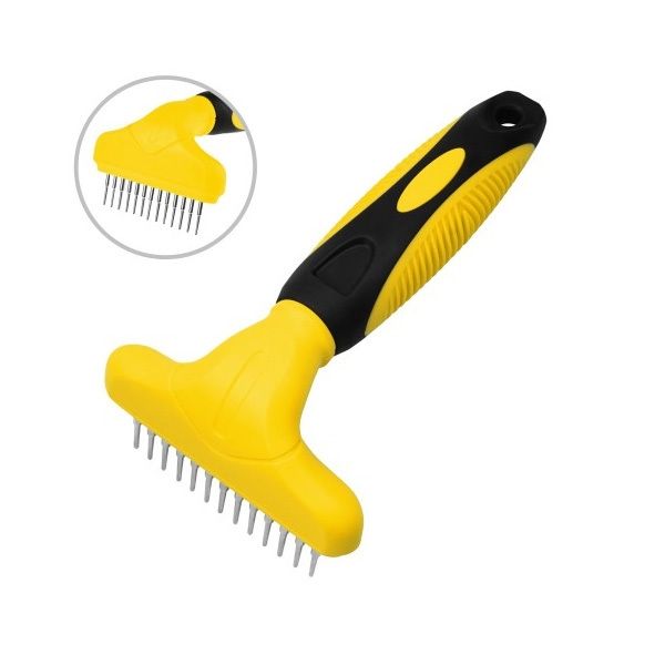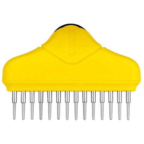 Опис гребінець граблі з крутиться зубомГребінець граблі Bronzedog для акуратного і інтенсивного розчісування шерсті і масажу шкірних покривів собаки. Робоча поверхня має ряд обертових зубів. Крутиться конструкція дозволяє більш ніжно і акуратно розплутати довгу і середню шерсть, а також масажувати шкірні покриви.Завдяки круглій конусоподібній формі зубчиків волоски шерсті не висмикуються і розплутуються дуже акуратно, а закруглені кінчики не пошкоджують шкіру. Матеріал зубчиків-сталь високої якості, не схильна до корозії і не викликає алергічних реакцій. Пластикова ручка з протиковзким покриттям запобігає ковзанню.Регулярне використання гребінця призводить шерсть і шкіру в порядок, стимулює приплив крові до клітин. Шкірні покриви отримують кисень і поживні речовини, оздоровлюючі шерсть. Вона блищить, має природний колір, а структура волосся стає міцною.
