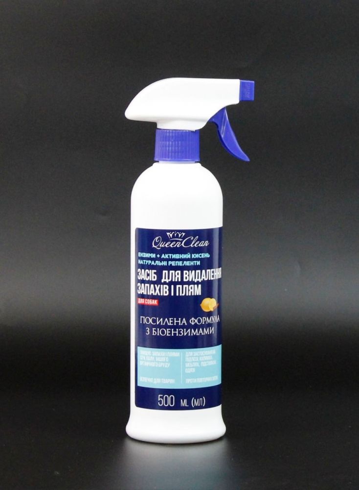 QueenClean Засіб для видалення запахів, плям і попередження повторних міток (для собак). Посилена формула з биоензимами, активним киснем і натуральними відлякувачами Рідкий засіб з активними биоензимами, яке швидко знищує, не маскуючи, запахи і стійкі плями життєдіяльності тварин, такі як сеча, кал, блювотні маси, кров і інші органічні забруднення (вино, кава тощо). Можна використовувати на всіх поверхнях: меблевій оббивці, килимах, підстилках, одязі, у салонах автомобіля, на деревянихі керамічних поверхнях.Інструкція по застосуванню: перед використанням QueenClean необхідно видалити залишки рідких і твердих забруднень. Попередньо рекомендується провести тестування поверхні, яка буде оброблятися, на стійкість кольору. Для цього потрібно нанести невелику кількість засобу на маленьку ділянку і почекати 5-10 хвилин. Промокніть поверхню чистою білою серветкою і огляньте її: якщо буде видно кольорові плями або розлучення води НЕ ВИКОРИСТОВУЙТЕ QueenClean. Якщо тестова поверхня залишиться незмінною, можна приступати до обробки забрудненої ділянки. Обильно нанесите средство на пятно, через 10-15 минут витрите остатки пятна салфеткой и дайте висохнуть поверхности природним путем, после чего запах и пятно полностью исчезнут.Перед использованием хорошо взболтатьНе использовать с другими средствами для виведения пятен и очистителямиПри удалении застарелих и пятен, что тяжело удаляются, рекомендуется после оработки накрить их пленкой, чтоби жидкость QueenClean дольше не висихалаПри первом использовании QueenClean запах мочи может сначала усилиться, но затем пропадетНекоторие сложние пятна могут потребовать обработки 2-3 разаНе використовувати як освіжувач повітря, не розпорошувати на тварин і людей.Склад: вода, натуральні ензими, концентрат кисню, натуральне ефірне масло лимона, натуральне ефірне масло кориці, поверхнево-активні речовиниВиробник сировини: JAPE Produkter AB, SwedenФлакони з розпилювачем обємом 500мл, 1000мл