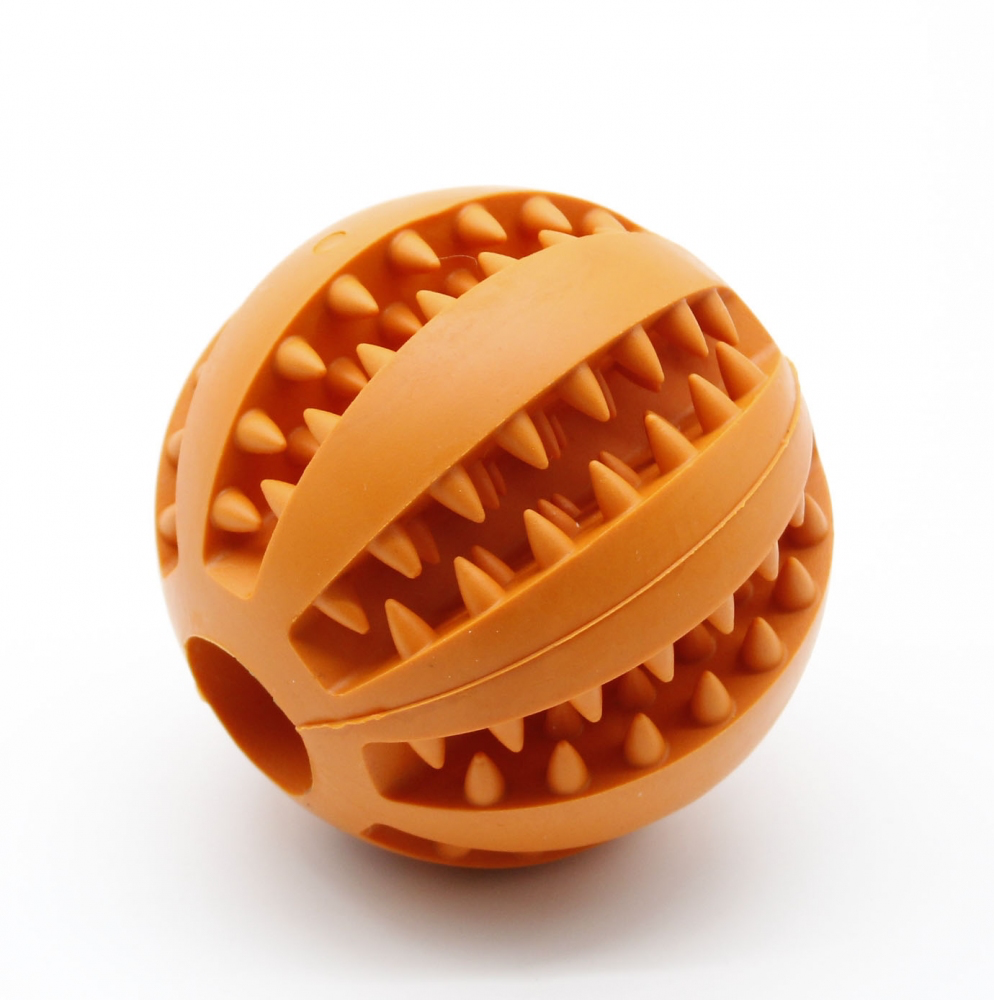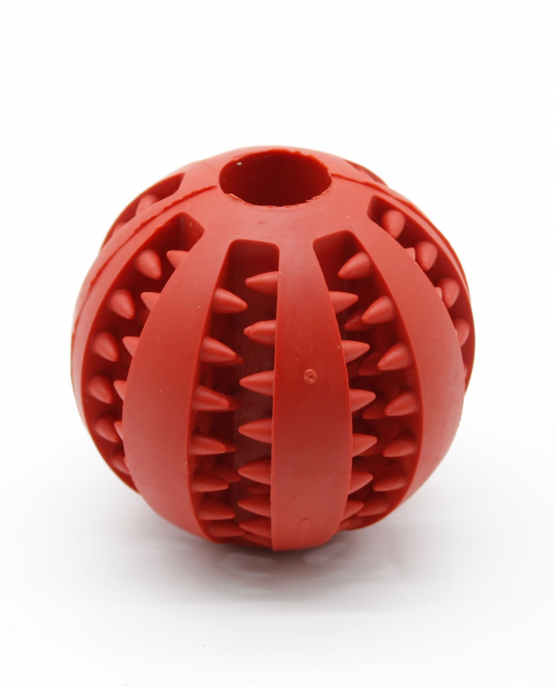 Іграшка з особливими шипами для масажу ясен і додаткового догляду за порожниною рота собаки. Мячик має рельєфні вставки, які при гризінні собакою сприяють очищенню зубів і профілактиці утворення зубного нальоту і зубного каменю. У поздовжні рельєфні області можна помістити шматочки ласощів або корму, що сприятиме привчанню собаки до жування спеціальних іграшок, а не предметів інтерєру, плюс приємний бонус для вашого вихованця, коли він залишається один. Виготовлений мяч з натурального каучуку має ментоловий аромат і повністю безпечний для здоровя собаки.