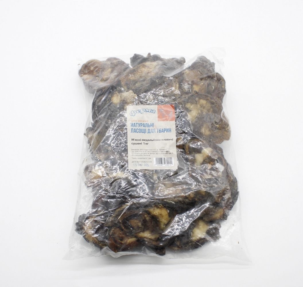 Мясні медальйони яловичі сушеніНайкращі ласощі для собаки натуральне мясо. При цьому не завжди зручно брати з собою на прогулянку, використовувати під час тренування або просто постійно тримати під рукою сире або навіть натуральне приварене мясо та мясопродукти. Прекрасна альтернатива сушені натуральні субпродукти, які собаки просто обожнюють Яловичина, вирощена природним чином на українському фермерському господарстві і висушена в печі на дровах, не залишить байдужим жодного хвостатого друга. Мясні медальйони ідеальні для дресирування і в якості перекусу. Також, ці ласощі сприяють гігієні порожнини рота, очищають наявний зубний камінь і запобігають утворенню нового. Медальончики виготовлені методом сушіння, без додавання консервантів, ароматизаторів і підсилювачів смаку. Подаруйте улюбленцю свою любов за допомогою наших смаколиків.