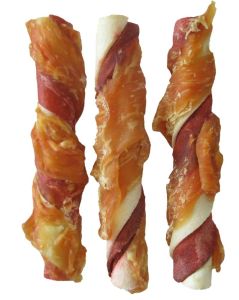 Довжина:12,5 див. Упаковка:1,125 кг, 30 шт. Склад:20 мяса курячої грудки, 75,99 коровячої шкіри, 0,01 барвника, 1 гліцерину, 1 сорбіту, 1,5 крохмалю, 0,5