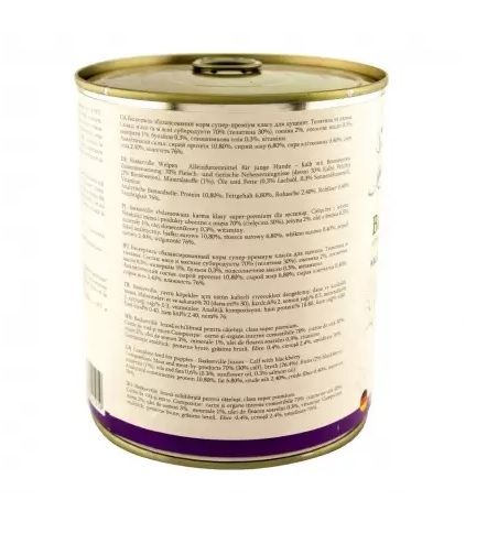 Склад:Мясо і мясні субпродукти 70 (телятина 30), ожина 2, лососеве масло 0,3, мінерали 1, бульйон 0,3, соняшникова олія 0,3, вітаміни.Аналітичні компоненти:Білки 10,8 Жири 6,8 Сира зола 2,4 Сире волокно 0,4 Вологість 76,0 Живильні добавки:Вітамін D3 200 МОкг Вітамін Е 20 мгкг Вітамін B1 10 мгкг Вітамін B2 6 мгкг Вітамін B6 2 мгкг Вітамін B12 75 мкгкг Нікотинова кислота 15 мгкг Пантотенова кислота 9 мгкг Фолієва кислота 0,35 Біотин 300 мкгкг Холинхлорид 1 200 мгкг Цинк 25 мгкг Марганець 1,4 мгкг Йод 0,75 мгкгВиробництво: Німеччина