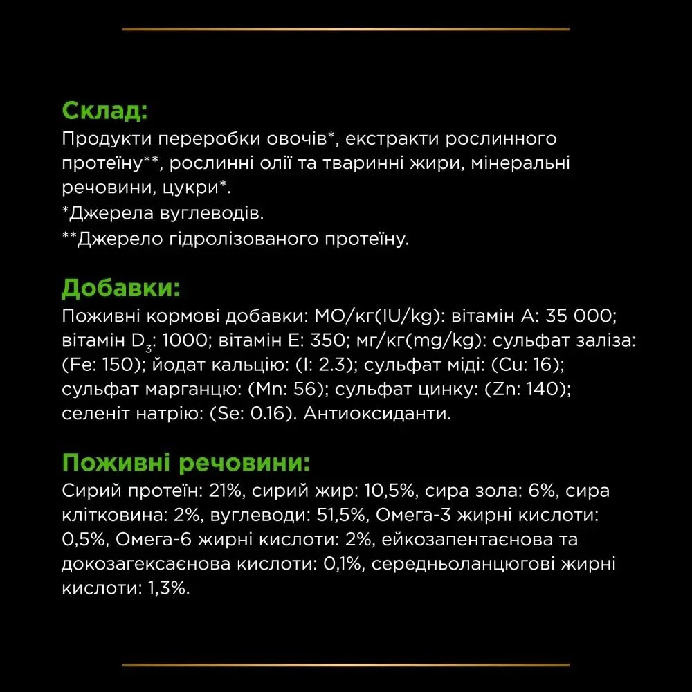 Дієтичний кормPro Plan для цуценят та дорослих собак для зниження ознак інгредієнтної та нутрієнтної непереносимостіКонсеровований повнораціонний дієтичний корм для цуценят та дорослих собак для зниження ознак інгредієнтної та нутрієнтної непереносимості. З гідролізованим протеїном та відібраними джерелами вуглеводів.Переваги:Добірні джерела білків і вуглеводів.Допомогає знизити непереносимості інгредієнтів і поживних речовин.Підходить для дорослих собак і цуценят.Клас корму - супер преміум.Виготовлено в ЄС.Склад:продукти переробки рослинного походження, екстракти рослинного протеїну, рослинні олії та тваринні жири, мінеральні речовини, цукри.Джерела вуглеводів.Джерело гідролізованого протеїну.Поживні кормові добавки:мгкг (mgkg) сульфат заліза: (Fe: 19) йодат кальцію: (І: 0.67) сульфат міді: (Cu: 2) сульфат марганцю: (Mn: 4.5) сульфат цинку: (Zn: 34) селеніт натрію: (Se: 0.089) таурин: 1200 MOкг (IUkg): вітамін D3: 215.Поживні речовини:сирий протеїн: 6.2, сирий жир: 3.7, сира зола: 2.1, сира клітковина: 2.1 Омега-3 жирні кислоти: 0,17, ейкозапентаєнова та докозагексаєнова кислоти: 0.06, Омега-6 жирні кислоти: 0.89. Волога: 74.3.