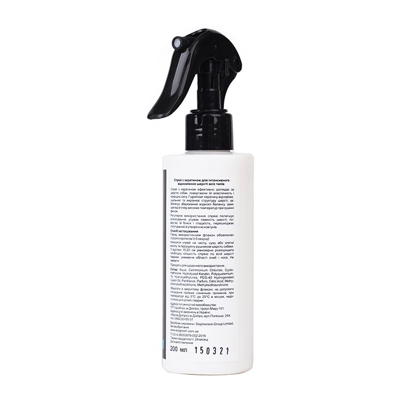 Ecogroom Спрей з креатином для інтенсивного відновлення всіх типів шерстіСпрей з креатином ефективно доглядає за шерстю собак, повертаючи їй еластичність і природну силу. Гідролізат кератину відновлює, ущільнює і вирівнює структуру вовни, що забезпечує збереження водного балансу, охороняє від дії високих температур при сушінні феном.Регулярное использование спрея облегчает расчесивание, устраняет ломкость шерсти, возвращает ей блеск и гладкость, препятствует спутивание и образование колтунов.Способ примененияПеред использованием флакон обязательно встряхнуть в течение 3-5 секундНаносить спрей на чистую, сухую или слегка влажную и подсушенную полотенцем шерсть собакиНа расстоянии 15-20 см равномерно нанести, необходимое спрея по всей шерсти животного.Избегать попадания в глаза нос и уши. Не смивать.Подходит для ежедневного использования.СоставAqua, Cetrimonium Chloride, Cyclomethicone, Hydrolyzed Keratin, PEG-40, Castor Oil, Parfum та інші.Зберігати у закритому флаконі, не допускати попадання прямих сонячних променів, при температурі від 5 до 25 градусів в місцях, недоступних для дітей і тварин.Термін придатності24 місяці