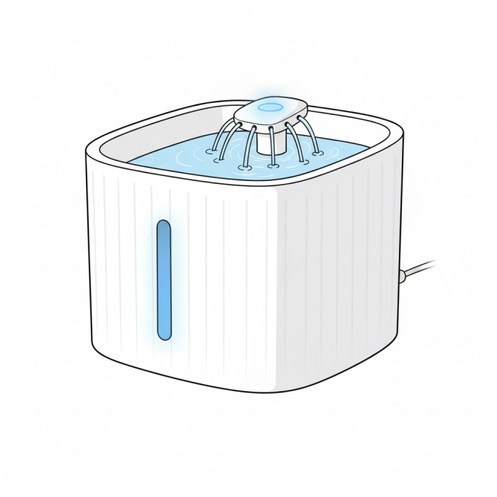 Живлення від USB-кабелю або портативного зарядного пристрою. Індикатор запасу води, безшумний насос, світлодіоди для контролю фільтрації. Фонтан має автоматичне відключення живлення, прозоре вікно для контролю рівня води та захист від висихання насоса.