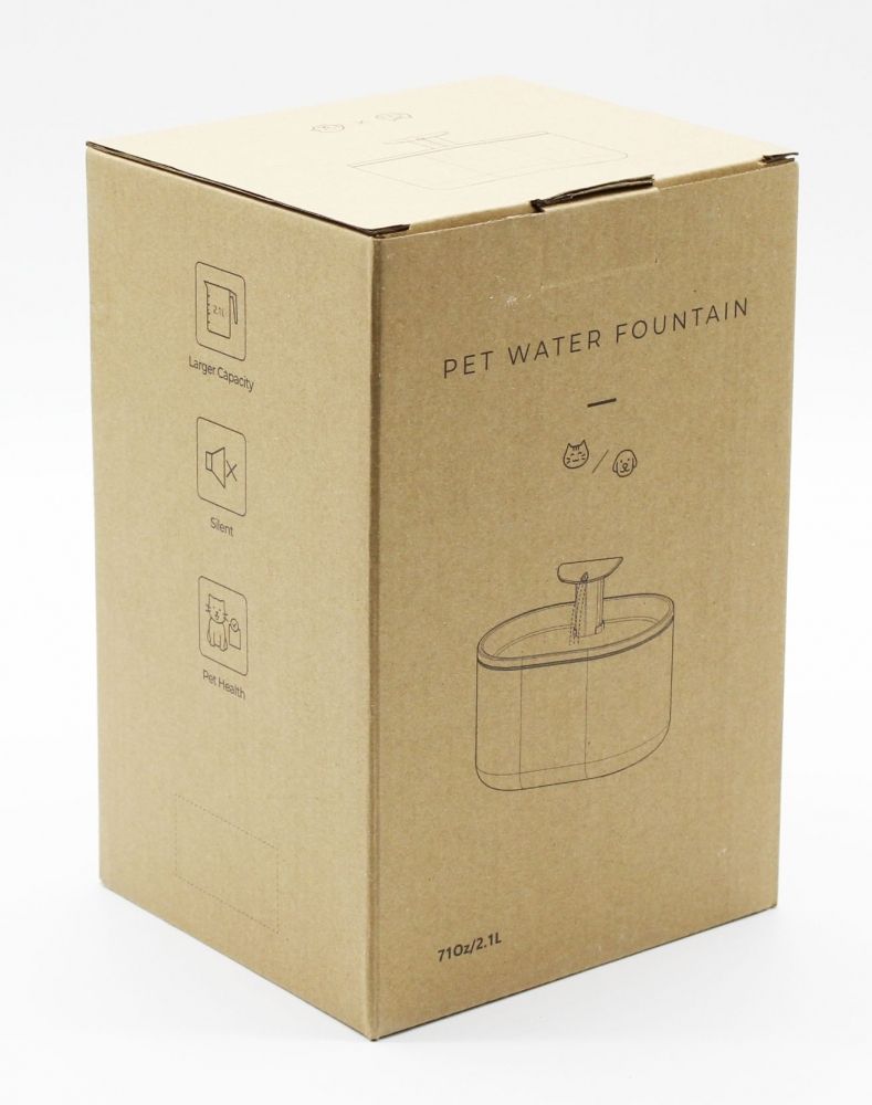 Ергономічний дизайн дозволяє легко доступати до піддону для води та піддону фільтра для доливання води та заміни фільтра. Всі деталі легко збираються та розбираються для очищення і заміни. Фонтан має ємність 2,1 л, видимий рівень води, безшумний робочий процес та поставляється з 1,5-метровим кабелем.