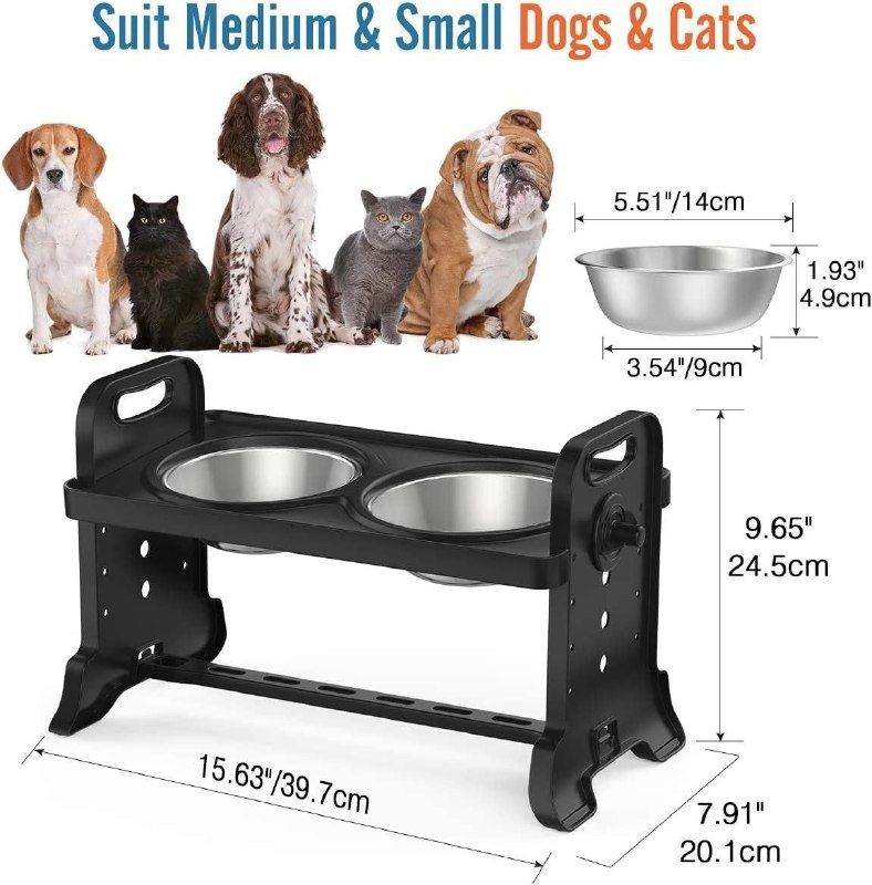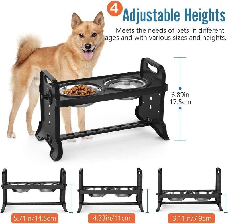 Регулюється на 4 висоти: доступні 4 різних висоти: 17,5 см 14,5 см 11 см 7,9 см.ви можете регулювати висоту відповідно до розміру вашого вихованця. Підходить для маленьких, середніх собак і кішок.2. Високоякісний матеріал: матеріал чаші з нержавіючої сталі, стійкі до іржі, довговічні. Подвійні миски можуть задовольнити потребу як в їжі, так і в воді. Доповнена зручною ручкою, підставка для чаш легко переміщається. Матеріал підставки-екологічний пластик.3. Не ковзає: протиковзкі вставки в нижній частині запобігають перевертання і ковзання стійки, коли ваші вихованці їдять.4. Завдяки регульованій підставці ці миски сприяють ефективному травленню і допомагають вашим улюбленим собакам або кішкам зменшити навантаження на шию і суглоби, викликану тривалим прийомом їжі з опущеною головою.5. Легко миється: миски можна мити в посудомийній машині або чистою водою.
