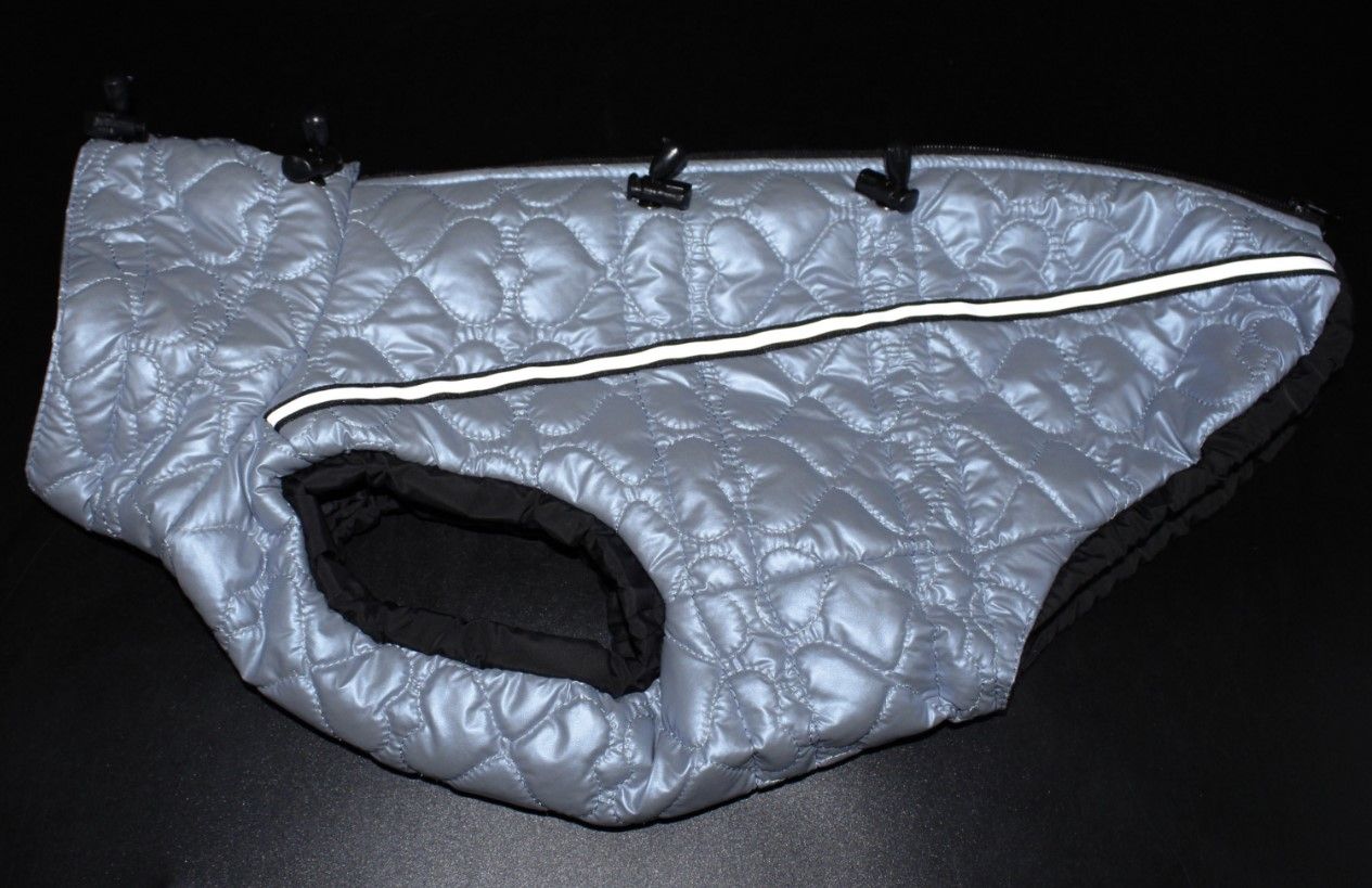 Жилет зі стьоганоі плащівкі на сіліконі.Застібка блискавка.Світовідбиваючі стрічки вздовж всього жилету, для більш зручноі фіксаціі утяжки на комірцях та на таліі.Підкладка шовкова (не електролізується).РозмірПородаДовжина спини, смОкружність грудей, смВага тварини, кгXXSЙоркширський терєр, той-терєр, чихуа-хуа, цуценята18-22 см25-31 смдо 1,4XSЙоркширський терєр, той-терєр, чихуа-хуа23-25 см32-40 смдо 2,2SЙоркширський терєр, той-терєр, чихуа-хуа26-29 см40-45 смдо 3S1Йоркширський терєр, пекінес (маленький), безпородні30-33 см40-46 смдо 4,5S2Пінчер, йоркширський терєр, пекінес, цуценята26-29 см46-57 смдо 4,5S3Мопс (маленький), ши-тцу, пекінес30-33 см46-57 смдо 6МТакса міні, чубата собачка, пудель, ши-тцу, фокс-терєр, безпородні33-37 см41-53 смдо 7М1Мопс (середній)31-37 см51-68 смдо 10LТакса (середня), спанієль дрібний38-43 см47-58 смдо 9L1Французький бульдог, мопс великий, спанієль середній38-43 см59-70 смдо 12XL1Боксер, спанієль, стаффордширський терєр50 см50-58 смдо 25XXLСтаффордширський терєр, такса54 см52-63 смдо 35XXL1Стаффордширський терєр50-55 см75-95 смдо 50XXXLРетривер, доберман, лабрадор, вівчарка, ротвейлер56-69 см85-105 смдо 60