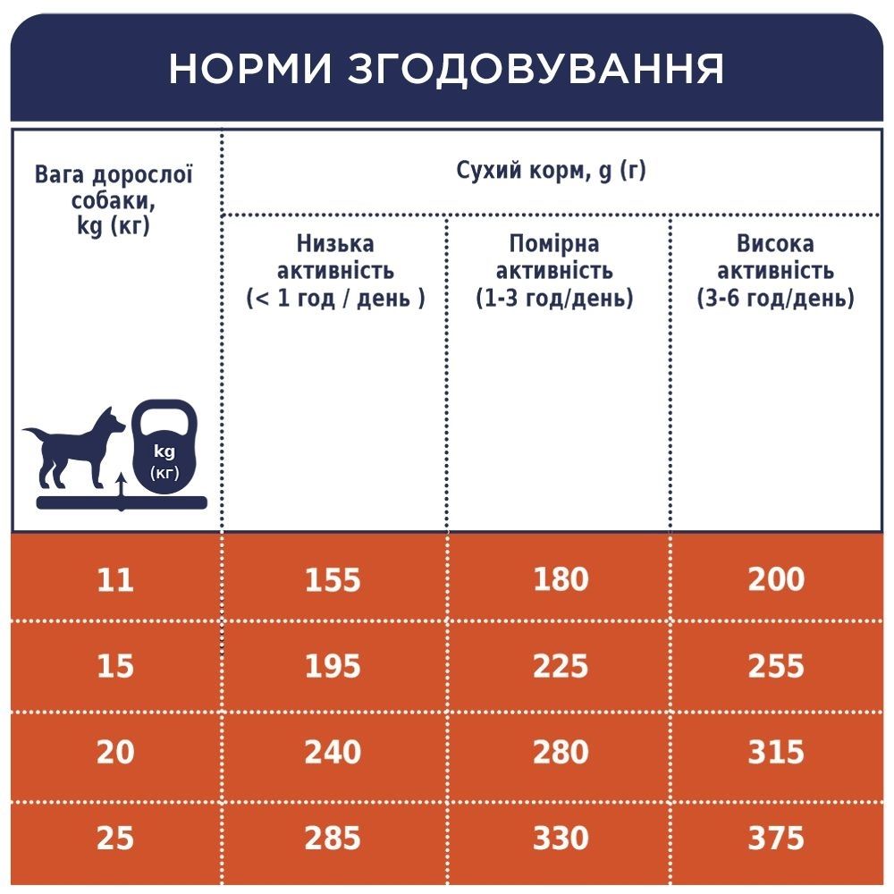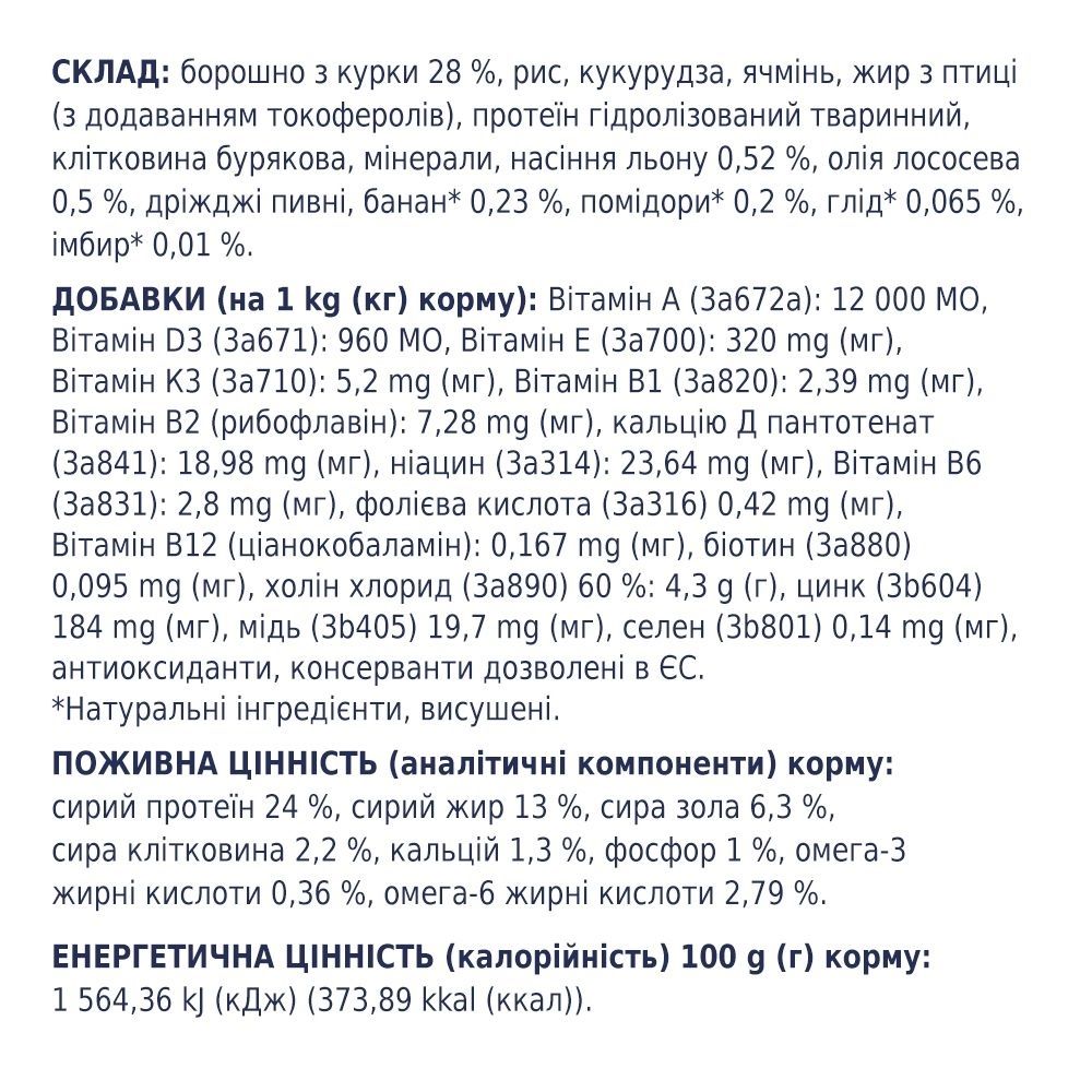 Борошно з курки 28, рис, кукурудза, ячмінь, жир з птиці (з додаванням токоферолів), протеїн гідролізований тваринний, клітковина бурякова, мінерали, насіння льону 0,52, олія лосося 0,5, дріжджі пивні, банан 0,23, помідори 0,2, глід 0,065, імбир 0,01.Опис товаруВід якості та складу харчування залежить здоровя улюбленця, тому потрібно ретельно підходити до вибору раціону на кожен день. Для представників середніх порід (вага 11-25 кг) український бренд Клуб 4 Лапи пропонує корм з оптимальним складом нутрієнтів і правильним показником калорійності. Він підходить для вихованців старше 12 місяців.Якщо ваш домашній улюбленець енергійний і активний, рекомендуємо корм Клуб 4 Лапи Adult All Breeds Active для собак. Харчування містить більше білка і підвищену енергетичну цінність для заповнення всіх потреб тварини.