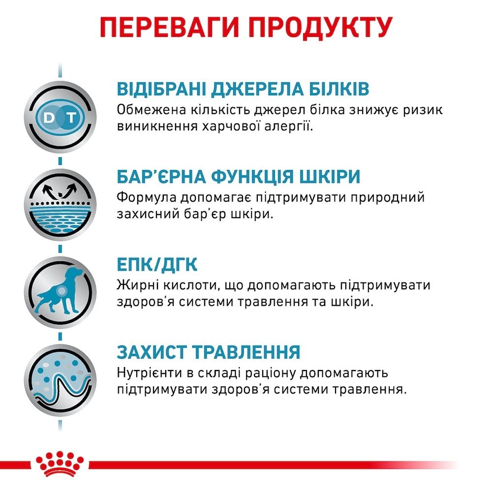 Ветеринарна дієта для собак при небажаній реакції на кормRoyal CaninSensitivity Control -Повнораціонний дієтичний корм для собак, склад якого розроблено для зниження ознак інгредієнтної та нутрієнтної непереносимості.Відібрані джерела протеїнів і вуглеводів.Відібрані джерела білків -Обмежена кількість джерелбілка знижує ризик виникнення харчової алергії.Барєрна функція шкіри -Формула допомагає підтримувати природний захисний барєр шкіри.Жирні кислоти, що допомагають підтримувати здоровя системи травлення та шкіри.Захист травлення -Нутрієнти в складі раціону допомагають підтримувати здоровя системи травлення.Якщо є підозра на харчову алергію або харчову непереносимість, собаку можна перевести на раціон SENSITIVITY CONTROL без поступового переходу. SENSITIVITY CONTROL може застосовуватися протягом усього життя. Рекомендується розділити добову норму на 2 прийоми.ПоказанняНебажана реакція на корм (НРК), що проявляється порушенням функції шкіри іабо травного тракту:діагностика: елімінаційна дієталікуванняАтопічний дерматит собак (CAD) + хронічний свербіж шкіриХронічна діареяПротипоказанняГострий панкреатитВагітністьлактація, рістМожна призначати у разі хронічного панкреатитуРекомендаціїПеред початком споживання слід проконсультуватися з ветеринарним лікарем. Годування кормом SENSITIVITY CONTROL від 3 до 8 тижнів.У разі зникнення симптомів кормової непереносимості, корм може бути призначений упродовж всього життя.ІнгредієнтиТапіока,дегідратовані протеїни мяса качки, рослинна клітковина,гідролізат протеїнів мяса птиці,тваринні жири,буряковий жом, рибячий жир,мінеральні речовини,соєва олія,оболонка та насіння подорожника, фруктоолiгосахариди,екстракт чорнобривців прямостоячих (джерело лютеїну).Джерела протеїнів:дегідратовані протеїни мяса качки,гідролізат білків мяса птиці.Джерело вуглеводів:тапіока.