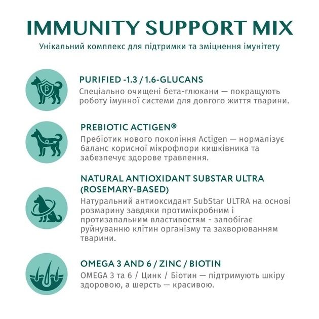 Optimeal.Повнораціонний сухий корм для дорослих собак мініатюрних порід з високим вмістом лосося.Підтримує здоровя вразливої травної системи мініатюрних порід собак.Спеціальна текстура гранул сприяє очищенню зубів від нальоту.Високий вміст свіжого мяса лосося та індички забезпечує високоякісним легкозасвоюваним протеїном.Містить комплекс для зміцнення імунітету Immunity Support Mix, корисні трави, ягоди, натуральні антиоксиданти та пребіотики.Омега-3 та 6, цинк, біотин допомагають підтримувати шкіру кота здоровою, а шерсть блискучою.Містить 69.5 протеїнів тваринного та рибного походження.SUPER PREMIUM формула. Раціон виготовляють під контролем ветеринарів за технологією швейцарської компанії Swiss Pet Nutrition GroupУнікальний комплекс для підтримки та зміцнення імунітетуImmunity Support Mixскладається з:Спеціально очищені бета-глюкани - покращують роботу імунної системи для довгого життя тварини.Пребіотик нового покоління Actigen - нормалізує баланс корисної мікрофлори кишківника та забезпечує здорове травлення.Натуральний антиоксидант SubStar ULTRA на основі розмарину, завдяки протимікробним і протизапальним властивостям - запобігає руйнуванню клітин організму та захворюванням тварини.Омега-3 та 6 Цинк Біотин - підтримують шкіру здоровою, а шерсть красивою.