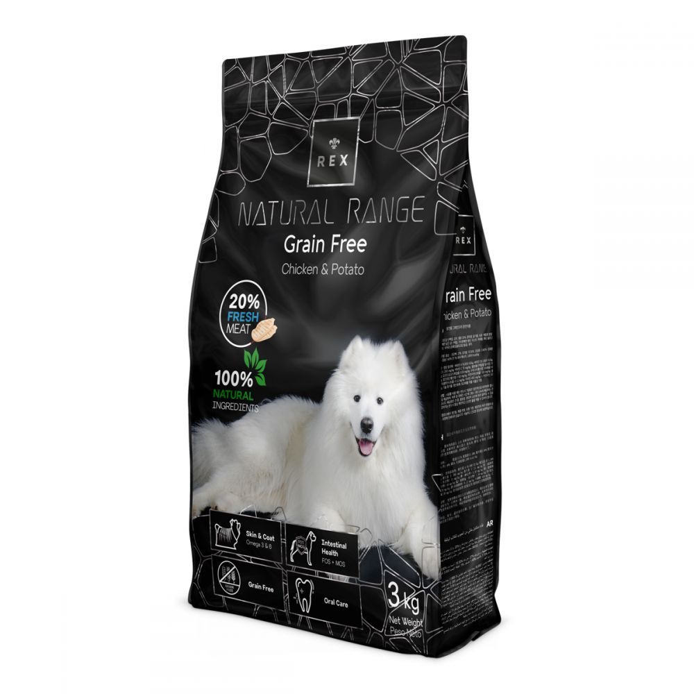 Rex Natural Range Grain Free Chicken Potato сухий беззерновой корм для собак з куркою і картоплеюПовнораціонний беззерновой сухий корм для дорослих собак які потребують делікатному харчуванні, корм є безглютеновим, що дозволить вихованцеві з алергією на глютен поліпшити якість життя на більш тривалий період.Переваги корму:покращує стан шкіри і шерстіпідтримує здоровя травної системибеззерновойкорм допомагає піклуватися про здоровя ротової порожниниСкладЗневоднений курячий білок, картопля, свіжа курятина (20), зелений горошок, курячий жир, яблучна мякоть, подрібнена камедь ріжкового дерева, гідролізат курячої печінки, гороховий білок, зневоднена риба, дріжджі, мінеральні речовини, мананолігосахаріди (МОС), цикорій (джерело ФОС), юка Шидігера.Технологічні добавки: Антиоксиданти: природні екстракти токоферолів.Виробник:AGROVECO, Іспанія
