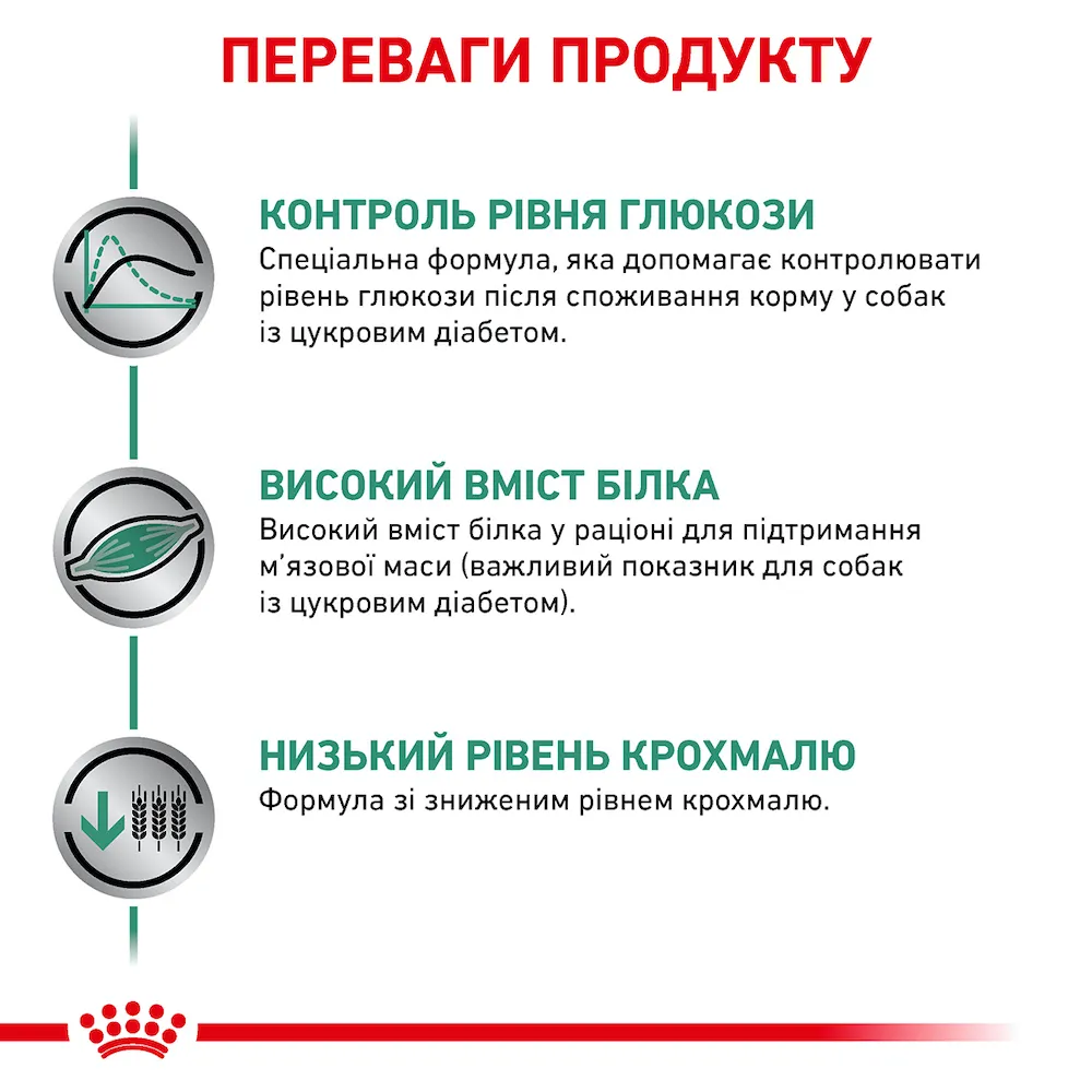 Цукровий діабет у собак – хронічне захворювання, яке знижує вироблення інсуліну і потребує спеціалізованого харчування. Royal Canin Diabetic Dog – лікувальний сухий корм, розроблений для дорослих собак із діабетом, який допомагає контролювати рівень глюкози в крові та підтримує загальне здоров’я. Формула з низьким вмістом крохмалю та вуглеводів із низьким глікемічним індексом запобігає різким стрибкам цукру після їжі.