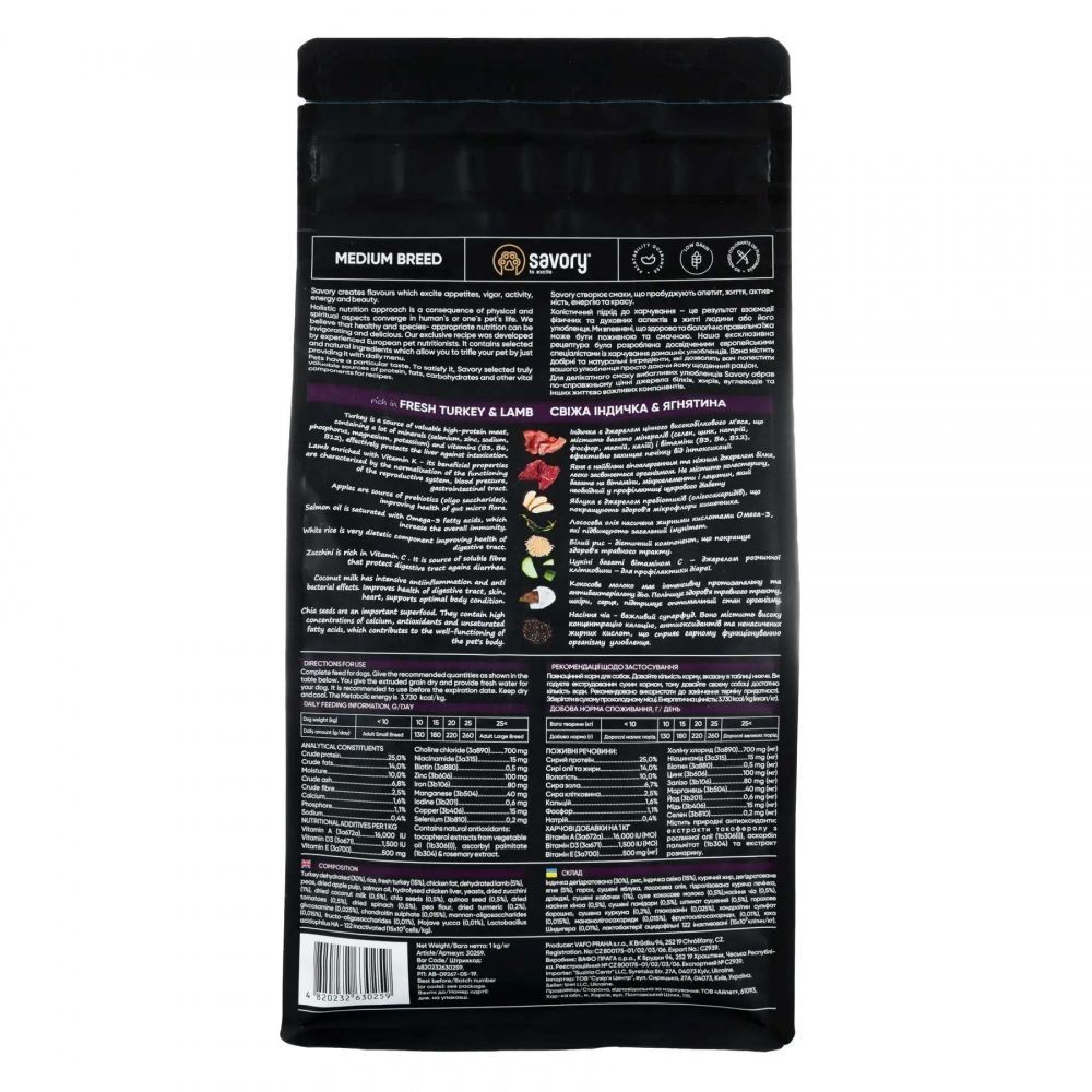 Сухий корм Savory Medium Breed rich in Fresh Turkey Lamb для дорослих собак середніх порідКорм класу холістік для собак середніх порід вагою від 10 до 25 кг.Повнораціонний сухий корм для собак середніх порід Savory пробудить у вашого улюбленця ту життєву енергію, про яку він навіть сам ще не знав.Ексклюзивна рецептура корму була розроблена досвідченими європейськими спеціалістами з харчування домашніх улюбленців. Використовуючи холістичний підхід, вдалося створити біологічно відповідний, здоровий раціон для собак, який є корисним і смачним настільки, що лапки оближеш. Поєднання добірних натуральних інгредієнтів дає можливість піклуватися про здоровя чотирилапого, а вишуканий смак дарувати йому насолоду від щоденного споживання корму Savory.Сухий корм для собак середніх порід Savory містить 50 якісного мяса індички та ягняти, суперфуди, цукіні, шпинат і помідори. Ці компоненти створені природою для завжди бадьорого і життєрадісного песика.Корм Savory корисне може бути смачнимПеревагиЦінне джерело білків мясо індички та ягняти.Унікальний комплекс пребіотиків, пробіотиків і мінералів для зміцнення імунітету.Підтримання оптимальної ваги рівномірний набір мязової маси без відкладання жиру.Пробіотик Lactobacillus acidophilus HA - 122 забезпечить відмінне травлення, засвоюваність корму, здоровий апетит та зміцнення природного імунітету.Високоенергетичний склад для покриття потреб енергійних песиків.Суперфуд для гармонійного розвитку та комфорту травлення.Містить хондропротектори для захисту суглобів.Збалансований низькозерновий склад.Гіпоалергенні інгредієнти.Не містить штучних барвників і штучних ароматизаторів-підхідNafNac.Опис компонентівЯгня є найбільш гіпоалергенним та ніжним джерелом білка, легко засвоюється організмом. Не містить холестерину, багате на вітаміни, мікроелементи та лецитин.Індичка високобілкове дієтичне мясо, яке легко засвоюється і має у своєму складі життєво важливі мінерали: селен, цинк, натрій, фосфор, магній, калій та вітаміни групи B.Яблука є джерелом пребіотиків (олігосахаридів), що покращують здоровя мікрофлори кишківника.Лососева олія насичена жирними кислотами Омега - 3, які підвищують загальний імунітет і надають блиску шерсті.Білий рис дієтичний компонент зі сприятливою дією на травну систему.Цукіні багаті вітаміном С для зміцнення імунітету та є джерелом розчинної клітковини для нормалізації процесів травлення.Кокосове молоко має інтенсивну протизапальну та антибактеріальну дію. Покращує роботу ШКТ, стан шкіри та серця, підтримує оптимальну кондицію організму.Насіння чіа суперфуд з високою концентрацією кальцію, антиоксидантів та ненасичених жирних кислот для правильного функціонування організму тварини.Насіння кіноа містить калій, рутин, мінеральні солі, каротин, ефірні олії, а також важливі для роботи шлунково-кишкового тракту пектин і клітковину.Помідори є джерелом антиоксидантів, які мають інтенсивний протизапальний ефект, покращують стан шкіри, роботу мозку і захищають серце.Шпинат джерело вітамінів групи B, знижує процеси окислення в організмі, нормалізує артеріальний тиск.Куркума зменшує запалення та має антибактеріальний ефект.Юкка Шидигера очищуючий ефект, мяка детоксикація та зменшення запаху екскрементів.Склад кормуІндичка дегідрована (30), рис, індичка свіжа (15), курячий жир, дегідроване ягня (5), с