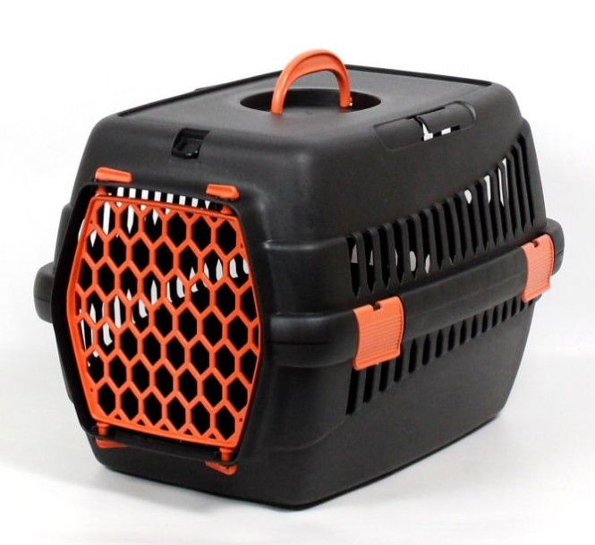 Переноска для тварин чорна пластик помаранчеві двері 55х39х36 см до 8 кг
