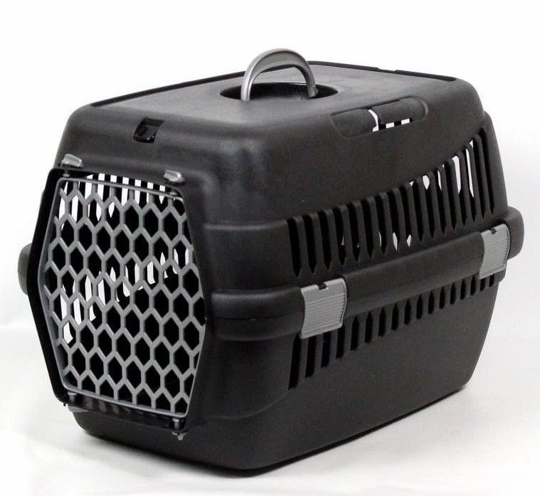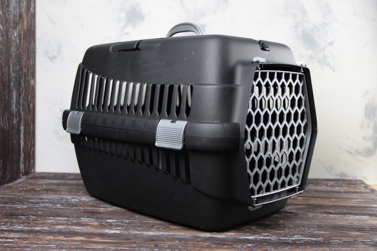 Переноска для тварин чорна пластик сірі двері 55х39х36 см до 8 кг