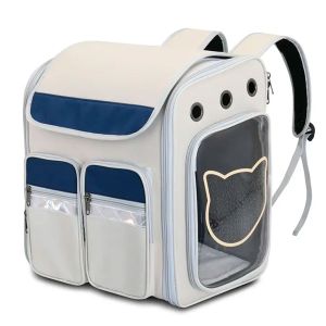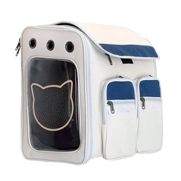 Матеріал оксфорд.Має отвори для повітря, зверху віконце з повітропроникної сітки зі шторкою на липучці.Попереду є 2 кишені на блискавці, з боків прозорі вікна, що дихають, з пластику, одне віконце відкривається як дверцята, мяка спинка, регульовані шлейки, ручка петля, всередині жорстке дно, хутряний килимок, поводок з карабіном.