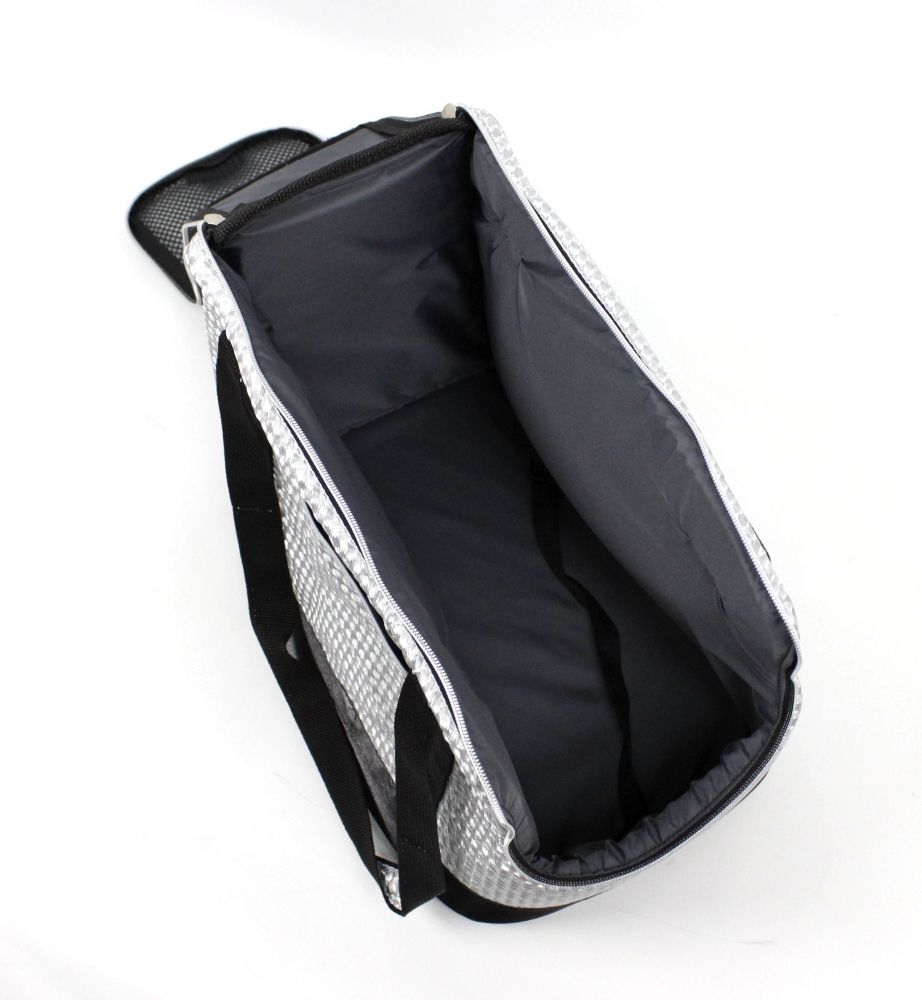 Декоративна плащівка З ефектом світловіддзеркалення. Знімне дно з тканини оксфорд. Збоку сітка, яка пропускає повітря, та кишеню для дрібничок, довгі ручки. Застібки блискавки. Наповнювач поролон.