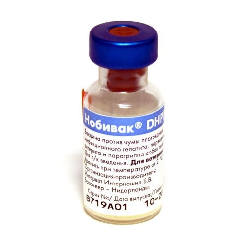 СКЛАД І ФОРМА ВЫПУСКАНобивак DHPPi суха жива вакцина противчуми мясоїдних,парвовирусного ентериту, аденовірусної інфекції та парагрипу собак. Кожна доза вакцини містить аттенуйовані штами: вірусу чуми мясоїдних (штам Onderstepoort) не менше 10 тис. ЦПД50 парвовируса собак (штам С154) не менше 10 млн. ЦПД50 аденовірусу (штам Manhattan LPV3 серотипу 2) не менше 10 тис. ЦПД50 вірус парагрипу (штам Cornell) не менше 316 тис. ЦПД50. Вакцина являє собою однорідну суху пористу масу білого кольору. В якості розчинника використовується стерильного фосфатно-буферний розчин Нобівак Розчинник (Nobivac Diluent) (рН 7,2 7,4) або одна з рідких вакцин: Нобівак RL, Нобівак Рабиес (Nobivac Rabies), Нобівак Лепто (Nobivac Lepto). Розфасована по 1 дозі в скляні флакони, запаковані по 10 штук в картонні коробки.ФАРМАКОЛОГІЧНІ СВОЙСТВАВакцинаНобивак DHPPiиндуцирует у щеплених тварин надійний протективний імунітет противчуми мясоїдних, парвовирусного ентериту, аденовірусної інфекції та парагрипу собакчерез 10 днів після повторної вакцинації. Штам Manhattan LPV3, серотип 2 індукує імунітет не лише до певного серотипу, але і до серотипу 1, який викликає інфекційний гепатит у собак. Напруженість імунітету достатня для забезпечення захисту тваринного проти чуми, парвовирусной, аденовірусної інфекцій і парагрипу мясоїдних протягом 12 місяців після вакцинації. Вакцина нешкідлива і ареактогенна.ПОКАЗАНИЯВакцину Нобівак DHPPi призначають собакам для профилактикичуми мясоїдних, інфекційного гепатиту, парвовирусного ентериту і парагрипу собак.ДОЗИ І СПОСІБ ПРИМЕНЕНИЯВакциной прищеплюють тільки клінічно здорових тварин.Собак починають прищеплювати з 8-тижневого віку, з повторнойвакцинациейв віці 12 тижнів. У разі, якщо необхідна більш рання захист від чуми мясоїдних і парвовирусного ентериту, першу вакцинацію можна проводити вакциною Нобівак Puppy DP у віці 4-х тижнів, з подальшою повторної вакцинацією вакциною Нобівак DHPPi за вищевказаною схемою. Тварин, раніше не щеплених і старше вищевказаного віку прищеплюють дворазово з інтервалом у 4 тижні. Рекомендується проводити щорічну одноразову ревакцинацію.У флакон з вакциною з допомогою стерильного шприца вносять 1 мл розчинника і ретельно перемішують до утворення однорідної суспензії. Після розведення, вакцину в кількості однієї дози тварині вводять підшкірно або внутрішньомязово з дотриманням правил асептики і антисептики. Всіх сприйнятливих тварин, які знаходяться в одному приміщенні, бажано вакцинувати одномоментно.ПОБІЧНІ ДЕЙСТВИЯПри підшкірному введенні у місці інєкції можливе утворення легкої припухлості, мимовільно зникаючої протягом одного-двох тижнів. У тварин після застосування вакцини можливі реакції гіперчутливості, в цьому випадку показано підшкірне введення адреналіну в рекомендованих дозах.ПРОТИВОПОКАЗАНИЯГиперчувствительность до компонентів вакцини.ОСОБЛИВІ УКАЗАНИЯДопускается застосування вакцини у собак під час вагітності. Перед вживанням флакон з вакциною рекомендується струсити. При порушенні цілісності флакона або по закінченню вказаного терміну придатності невикористана вакцина підлягає знезараженню шляхом кипятіння протягом 5-10 хвилин.УМОВИ ХРАНЕНИЯВакцину зберігають і транспортують в сухому, захищеному від світла місці при температурі від 2 до 8 С. Заморожування вакцини не допускається. Термін придатності 2 роки.ПРОИЗВОДИТЕЛ