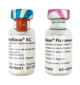 Опис вакцини Нобівак КСНобівак КСПарагрип і бордетеллез це інфекційні захворювання собак, які входять до групи так званого вольєрного або питомникового кашлю, мають схожу симптоматику. Щорічна вакцинація від цих неприємних недуг здатна запобігти зараження практично повністю. Для цього у ветеринарії використовується жива суха вакцина Нобівак КС.Препарат являє собою скляні флакони з аттенуированними очищеними штамами парагрипу і бордетельозу і розчинником Нобівак Дилуент.З допомогою Нобівак КС на четвертий день після вакцинації формується імунна відповідь організму на збудник бордетельозу, а через 3 тижні на збудник парагрипу, який зберігається протягом усього року.Інструкція по застосуваннюВідповідно до інструкції від виробника вакцинацію можна проводити клінічно здоровим собакам, починаючи з віку 2 тижнів. Препарат безпечний, тому дозволений для профілактики вказаних захворювань вагітним сукам.З допомогою шприца набирають розчин Нобівак Дилуент і вводять у флакон з вакциною. Після розчинення і зігрівання до кімнатної температури вакцину з допомогою того ж шприца без голки впорскують тварині в кожну ніздрю. Допустимі через деякий час невеликі виділення з очей і носа у маленьких підсисних цуценят, що не представляє для них небезпеки. Для формування стійкої імунної відповіді не можна одночасно з вакцинацією застосовувати антибіотики, а також вводити Нобівак КС спільно з интраназальними лікарськими засобами. Собак, що живуть разом, вакцинують одночасно. Вакцина придатна до застосування протягом 2 років за умови дотримання температурного режиму в межах 2-8 при зберіганні і транспортуванні. На сьогоднішній день вакцину для собак Нобівак КС купити просто, достатньо замовити її у нашому інтернет-зоомагазині.