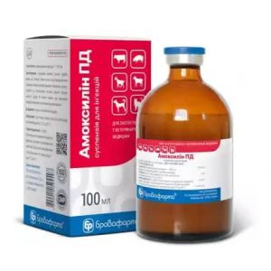 Склад1 мл препарату містить:амоксициліну тригідрат 150 мгОписСуспензія кремового кольору.Фармакологічні властивостіАнтибактеріальний препарат широкого спектру дії, належить до антибіотиків амінопеніцилінової групи, має пролонговану дію. Блокує синтез клітинних стінок бактерій, гальмує активність ферментів транспептидази і карбоксипептидази.Діє бактерицидно на грампозитивні мікроорганізми Staphylococcus spp., Streptococcus spp., Arcanobacterium spp., Corynebacterium spp., Clostridium spp., Bacillus anthracis, Listeria monocytogenes, Erysipelothrix rhusiopathiae, грамнегативні мікроорганізми Pasteurella spp., Haemophilus spp., Actinobacillus spp., Escherichia coli, Salmonella spp., Moraxella spp., Fusobacterium spp.Після введення швидко всмоктується з місця інєкції та розподіляється по всіх тканинах організму, майже не звязується з білками плазми крові. Максимальна концентрація в крові досягається протягом 2-3 годин, терапевтична концентрація зберігається 48-72 години. До спинномозкової рідини надходить 10-60 від вмісту у сироватці крові. З організму виводиться в незміненому вигляді з сечею (10-25), частина з жовчю та молоком.В печінці метаболізується до амоксицилінової кислоти та амоксицилін дикетопіперазину. При порушенні функції печінки період напіввиведення амоксициліну не змінюється.ПоказанняЛікуваннявеликої рогатої худоби, овець, кіз, свиней, собак, котівза захворювань ШКТ, органів дихання (пневмонія, бронхіт, трахеїт), сечостатевої системи (цистит, метрит, мастит), шкіри та мяких тканин, що спричинені мікроорганізмами, чутливими до амоксициліну.ПротипоказанняНе застосовувати тваринам із підвищеною чутливістю до пеніцилінів та цефалоспоринів, порушеннями функції нирок (анурія, олігурія). Не використовувати внутрішньовенно.Не призначати кролям, мурчакам, хомякам, шиншилам та іншим дрібним травоїдним тваринам, а також коням (амоксицилін негативно впливає на бактеріальну флору сліпої кишки), лактуючим вівцям, молоко яких вживають в їжу люди.Не застосовувати одночасно із хлорамфеніколом, лінкозамідами, тетрациклінами, макролідами та сульфаніламідами, при інфекціях, спричинених мікроорганізмами, які продукують бета-лактамази.Спосіб застосування та дозиПеред використанням флакон з препаратом ретельно струшують. Препарат використовують одноразово, внутрішньомязово у дозі 1 мл на 10 кг маси тіла (15 мг амоксициліну на 1 кг маси тіла). За необхідності інєкцію повторюють через 48 годин.Інєкції, обєм яких перевищує наведені нижче значення, ділять на кілька частин і вводять у різні місця:велика рогата худоба 20 мл,свині 10 мл,вівці 5 мл.ЗастереженняПісля останнього застосування препарату забій великої рогатої худоби, овець, кіз на мясо дозволяється через 16 діб, свиней через 20 діб. Людям вживати в їжу молоко можна через 3 доби. Мясо та молоко, отримані раніше вказаного терміну, утилізують або згодовують непродуктивним тваринам, залежно від висновку ветеринарного лікаря.Умови зберіганняУ сухому, темному, недоступному для дітей місці за температури від +10 до 25 С.Після відкриття флакона препарат зберігати в холодильнику і використати протягом 28 діб.Термін придатності2 роки.