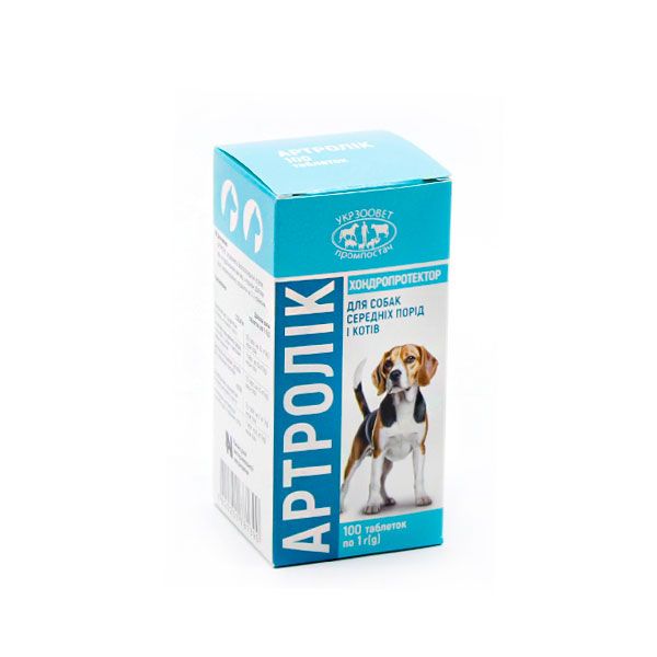 Призначають собакам та котам самостійно або в складі комплексної терапії за запальних і дегенеративних захворювань опорно-рухового апарату (остеоартроз), що виникають на тлі травм різного генезу, вікових змін (дисплазія кульшових суглобів), при підвищених фізичних навантаженнях.У період відновлення після хірургічних операцій на опорно-руховому апараті тварини з метою прискорення репаративних процесів.Для профілактики цуценятам і кошенятам в період активного росту.Тваринам старшого віку для попередження вікових дегенеративних змін у суглобах.Дозування:АРТРОЛІК згодовують безпосередньо з руки, або у подрібненому вигляді з кормом.Добову дозу рекомендовано розділити на 2-3 прийоми.АРТРОЛІК слід застосовувати протягом не менше 6-8 тижнів, з профілактичною метою застосування рекомендовано повторювати з інтервалом в 3 місяці.Можливе постійне застосування.Застосування АРТРОЛІК не виключає призначення інших ветеринарних препаратів, вітамінно-мінеральних комплексів і добавок.Під час вагітності, лактації перед використанням проконсультуватися з лікарем ветеринарної медицини.Побічна дія:В рідкісних випадках у окремих тварин, що є чутливими до компонентів препарату, можуть спостерігатися алергічні реакції.Застосування препарату в цьому випадку припиняють.Протипоказання:Підвищена індивідуальна чутливість тварин до компонентів препарату, тяжкі розлади функції печінки та нирок.Склад:1 г препарату містить діючі речовини (мг):глюкозаміну гідрохлорид - 250,0хондроїтину сульфат - 102,0метилсульфонілметан (МСМ) - 75,0Допоміжні речовини:аскорбінова кислота (вітамін С), марганцю сульфат, кальцію стеарат, цукрова пудра, мікрокристалічна целюлоза, діоксид кремнію, пивні дріжджі, крохмаль кукурудзяний.
