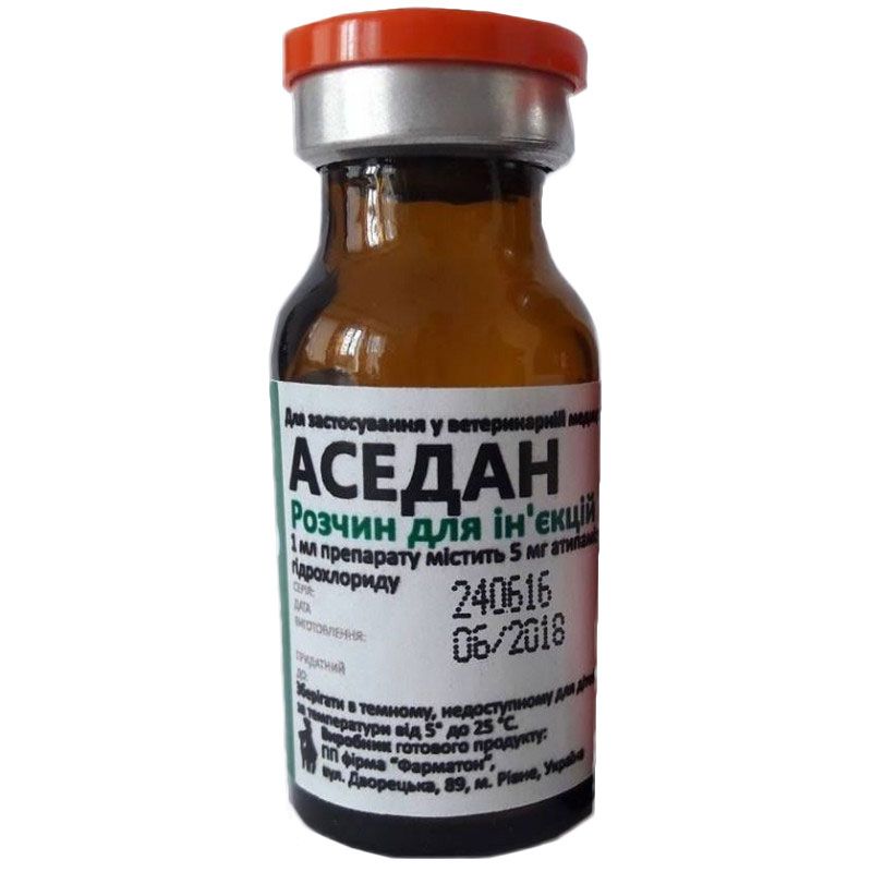 Аседан(розчин дляінєкцій)ОписПрозора безбарвнарідина.Склад1 мл препарату містить діючу речовину:атипамізолугідрохлорид 5 мгДопоміжні речовини: натрій хлорид,метилпарагідроксибензоат,вода для інєкцій.Фармакологічні властивостіАседан відноситься до групи альфа-2-антагоністів, містить атипамізолу гідрохлорид, який вибірково блокує альфа-2-рецептори, що викликає викид норадреналіну в центральній і периферичній нервовій системі. Це призводить до стимулювання симпатичної нервової системи, в результаті чого усувається седативна дія медетомідину гідрохлориду (Проседан). Аседан швидко всмоктується після внутрішньомязового введення і через 10-15 хвилин досягає максимальної концентрації в крові. Атипамізол гідрохлорид метаболізується, в основному, в печінці, частково в нирках. Виділяється головним чином з сечею у вигляді метаболітів. Період напіввиведення - 1 година.ЗастосуванняАседан застосовують з метою усунення седативної і аналгетичної дії медетомідину у собак і котів, а також, при необхідності, усунення побічної дії медетомідину на серцево-судинну і дихальну системи. Аседан рекомендується застосовувати через 15-60 хвилин після введенняПроседану. Зазвичай седативна дія медетомідину у тварин знімається протягом 5-10 хв.ДозуванняАседан вводять тваринам внутрішньомязово одноразово:-для собакдоза Аседану в мл дорівнює дозі введеного медетомідину.-для котівдоза Аседану в мл дорівнює половині введеної дози медетомідину.У випадку тривалого пригніченого стану у тварин рекомендується повторне введення Аседану через 10-15 хвилин.Побічна діяПротягом перших 10 хвилин після введення атипамізолу гідрохлориду можливий розвиток транзиторного гіпотензивного ефекту, гіперактивності, тахікардії, слинотечі, мязевого тремору, блювоти, підвищення частоти дихальних рухів неконтрольоване сечовипускання і дефекація.У котів після введення препарату можливий розвиток гіпотермії.ПротипоказанняСерцева недостатність, порушення функцій печінки або нирок, вагітність і лактація у самок.ЗастереженняАседан не застосовують для усунення дії інших седативних засобів.Форма випускуФлакони із темного скла, закриті гумовим корком під алюмінієву обкатку по 2 і 10 мл, вкладених у картонну коробку з листівкою-вкладкою.ЗберіганняСухе темне, недоступне для дітеймісцезатемпературивід 5 до 25 С.Термiн придатності 2 рокипісля відкриття флакона до30діб.Для застосування у ветеринарній медициніВиробник готового продукту:ПП фірма Фарматон,вул. Дворецька, 89, м. Рівне,Україна