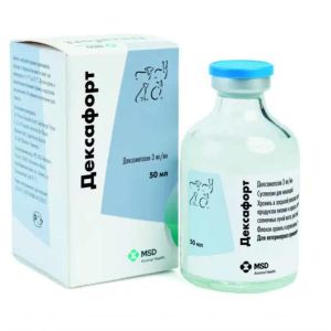 Дексафорт зелений дексаметазон, проти запалення та алергіїСклад та форма випускуДексафорт гормональний лікарський засіб, що містить в 1 мл як діючі речовини 2,67 мг дексаметазону фенілпропіонату та 1,32 мг дексаметазону натрію фосфату, а також допоміжні компоненти: 4,0 мг хлориду натрію, 11,4 мг натрію цитрату 4 мг бензилового спирту, 0,4 мг метилцелюлози МН 50 та води для інєкцій до 1 мл.Є стерильною водною суспензією для інєкцій білого кольору.При зберіганні допускається утворення осаду, який при струшуванні розбивається на рівномірну суспензію.Розфасовують по 50 мл у скляні флакони, які упаковують у картонні коробки.Фармакологічні властивостіДексаметазон, що входить до складу препарату, є синтетичним аналогом кортизолу глюкокортикостероїдного гормону кори надниркових залоз.Має більш виражену глюкокортикостероїдну дію, має протизапальну, протинабрякову, десенсибілізуючу та протиалергічну дію.Механізм дії гормону полягає у пригніченні вивільнення еозинофілами та опасистими клітинами медіаторів запалення.Дексаметазон діє на всі етапи запального процесу: інгібує синтез простагландинів на рівні арахідонової кислоти, синтез запальних цитокінів (інтерлейкін 1, фактор некрозу пухлини альфа та ін), а також підвищує стійкість клітинної мембрани до дії різних факторів, що ушкоджують.Дексафорт стимулює стероїдні рецептори лімфоцитів, сприяючи утворенню ліпокортину, що мають протинабрякову активність.Пригнічує проліферацію лімфоїдної тканини та клітинний імунітет, а також порушує кінетику Т-лімфоцитів, знижуючи їхню цитотоксичну активність.В-лімфоцити стійкіші до дії глюкокортикоїдів, але введення лікарського засобу у високих дозах веде до зниження концентрації імуноглобулінів, що повязано з початковим посиленням їх катаболізму та подальшим гальмуванням синтезу.Дексафорт відрізняється швидкістю дії та тривалістю ефекту.Після внутрішньомязового введення дексаметазон фосфат натрій починає швидко всмоктуватися з місця введення.Дексаметазон фенілпропіонат всмоктується повільніше та забезпечує тривалий ефект.Максимальна концентрація дексаметазону в плазмі виявляється через 60 хвилин.Терапевтична концентрація у сироватці крові зберігається 30 96 годин залежно від виду тварини.Біодоступність при внутрішньомязовому введенні становить 100.Біотрансформація дексаметазону відбувається у печінці та частково у фібробластах, що беруть участь у процесі метаболізму.Метаболіти в основному виводяться з фекаліями та сечею.ПоказанняПризначають великої рогатої худоби, коням, свиням, вівцям, козам, собакам і кішкам для лікування запальних процесів та захворювань, що мають алергічну та аутоімунну етіологію (алергічні дерматити, екзема, посттравматичні набряки, бронхіальна астма, захворювання суглобів).Дози та спосіб застосуванняДексафорт вводять великої рогатої худоби, коням, свиням, вівцям і козам внутрішньомязово, собакам і кішкам внутрішньомязово або підшкірно одноразово в наступних дозах: великої рогатої худоби та коням - 10 мл, телятам, лошатам, вівцям, собакам 0,5 1 мл, кішкам 0,25 0,5 мл.За потреби препарат застосовують повторно через 7 днів.Перед кожним використанням флакон із дексафортом ретельно струшують до отримання рівномірної суспензії.При лікуванні запалень ускладнених патогенною та умовно патогенною бактеріально