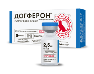 Ветеринарний лікарський препарат Догферон препарат інтерферону собаки, застосовують цуценятам і дорослим собакам при інфекційних захворюваннях собак, з лікувальною метою при парвовірусному ентеритеСоставДогферона для лікування вірусних і бактеріальних хвороб у собакВ 1 мл в якості діючої речовини препарат містить альфа-інтерферон собаки з противірусною активністю 1 000 000 міжнародних одиниць (МО).Форма випускаРаствор для інєкцій.ФасовкаВипускают лікарський препарат Догферон розчин для інєкцій розфасованим по 2,5 мл у скляні силіконізовані флакони обємом 3 мл, герметично закупорені гумовими пробками і обтиснуті алюмінієвими ковпачками.Препарат у флаконах місткістю 3 мл упаковують в ложемент корекс (ніздрюватий пластиковий короб) по 5 флаконів. Ложемент індивідуально поміщають у пачку (вторинна (споживча) упаковка). Кожну одиницю упаковки забезпечують інструкцією по застосуванню.Фармакологічні свойстваМеханизм дії полягає в пригніченні репродукції ДНК- і РНК-вмісних вірусів в інфікованих клітинах, підвищення резистентності здорових клітин організму до зараження вірусами, посилення фагоцитарної активності макрофагів та збільшення специфічної цитотоксичності лімфоцитів.Догферон має противірусну і імуностимулюючим дією.Застосування і дозировкаЛекарственний препарат Догферон розчин для інєкцій вводять внутрішньомязово в терапевтичній дозі 1 000 000 МО на 10 кг маси тіла, що відповідає 1,0 мл, 1 раз на день. Для цуценят і собак вагою менше 10 кг застосовується та ж терапевтична доза 1 000 000 МО (1,0 мл) препарату 1 раз на день. Курс лікування становить 5-7 днів. Бажано починати лікування при перших симптомах інфекційного захворювання.ПротивопоказанияПротивопоказанием до застосування лікарського препарату є індивідуальна підвищена чутливість тварини до интерферонам, тяжлие алергічні та аутоімунні захворювання, а також тяжлие ураження печінки, гіпохромна анемія. Не рекомендується застосовувати Догферон після вакцинації тварин протягом 10 днів. Не рекомендуется применять лекарственний препарат Догферон беременним и кормящим собакам.Условия хранения, срок годностиХранить лекарственний препарат следует в закритой упаковке производителя, в защищнном от прямих солнечних лучей месте, отдельно от пищевих продуктов и кормов, при температуре от 2 до 8 С.
