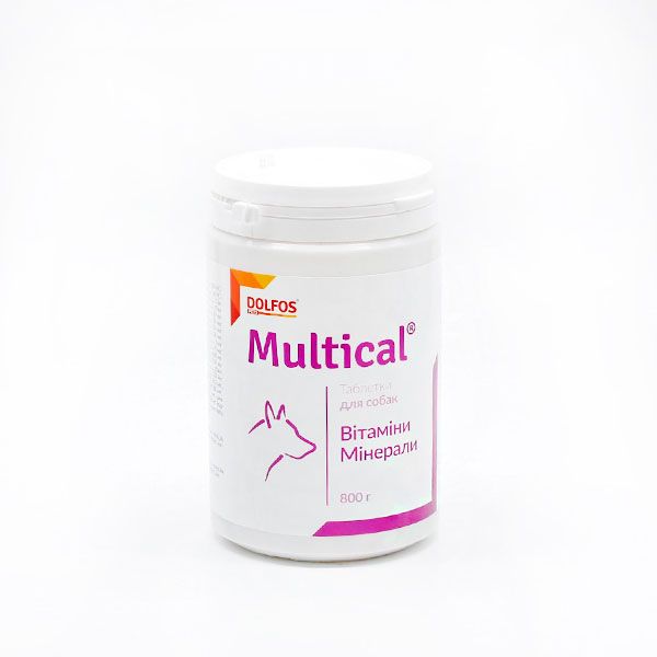 Мультикаль для собак у таблетках, відро 800 гВказівки:Долфос Мультикаль містить вітаміни, мікро- і макроелементи в оптимальному співвідношенні, необхідні для правильного розвитку і функціонування організму собаки. Препарат покращує загальний стан організму, профілактує мінерально-вітамінні дефіцити і порушення обміну речовин, посилює імунітет, покращує травлення, якість вовняного покриву. Рекомендовано використовувати вагітним і лактуючим сукам, як допоміжний компонент при лікуванні рахіту, остеомаляції, остеопорозу, переломів і в період зміни зубів.Рекомендований курс прийому - 30 діб. Після прийому одного курсу потрібно витримати перерву від -7 до 15 діб. За необхідності курс повторити.Дозування:1 таблетка на 10 кг маси тіла.Застосовуючи комплекс цуценятам, вагітним і лактуючим тваринам, добову норму слід збільшити вдвічі.Добавка задається з їжею.Упаковка:510 табл. Маса нетто: 800 г.1 таблетка містить:Вітамін А 250 МОВітамін D3 30 МОВітамін E 3 мгВітамін С 10 мгВітамін K 50 мкгВітамін B1 50 мкгВітамін B2 110 мкгВітамін B6 50 мкгВітамін B12 1 мкгБіотин 20 мкгНікотинова кислота 600 мкгПантотенова кислота 500 мкгФолієва кислота 22 мкгХоліну хлорид 1,5 мгМікроелементи:Залізо (сульфат заліза (II) Н2О Е1) 2 500 мкг (міні: 834 мкг), марганцю (марганцю (II) оксид е5) 200 мкг (міні: 58 мкг), мідь (міді сульфат 5H2O Е4) 300 мкг (міні: 100 мкг), цинку (цинку сульфат Н2О Е6) 3 000 мкг (міні: 1000 мкг), йод (йодид калію Е2) 75 мкг (міні: 25 мкг), селен (натрію (IV) селеніт Е8) 22 мкг (міні: 7,3 мкг). Аналітичні показники:Кальцій 250 мг (міні: 80 мг), з черепашок молюсків 85 мг (міні: 28 мг), фосфор 125 мг (міні: 41 мг), магній 40 мг (міні: 13,3 мг), натрій 14 мг (міні: 4,6 мг).Склад:кальцію дифосфат, сухі пекарські дріжджі, магнію карбонат, кальцію карбонат із раковин молюсків, оксид магнію, мальтодекстрин, стеарат магнію.