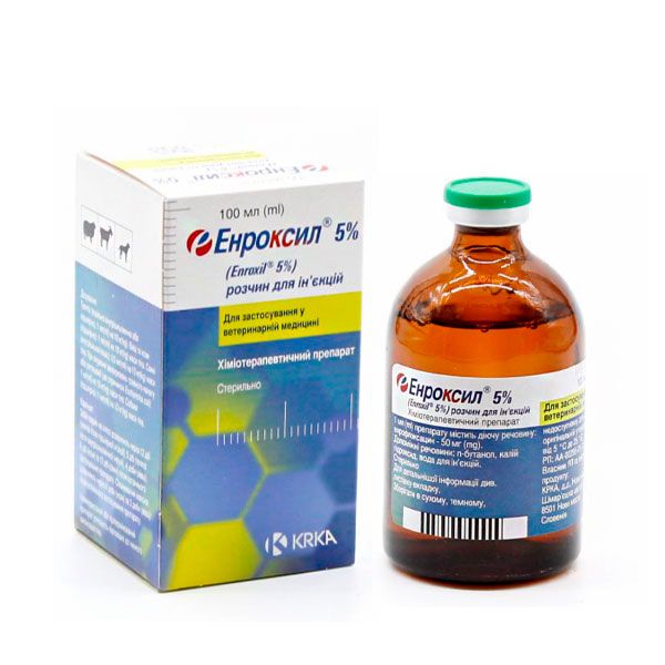 СКЛАД І ФОРМА ВИПУСКУ Енроксил 5 розчин в якості діючої речовини в 1 мл містить 0,05 г енрофлоксацину, а також допоміжні компоненти. За зовнішнім виглядом представляє собою прозорий розчин світло-жовтого кольору для застосування всередину. Препарат розфасовують у флакони з темного скла по 50 і 100 мл ФАРМАКОЛОГІЧНІ ВЛАСТИВОСТІ Діюча речовина препарату фторхінолон (енрофлоксацин) має протимікробну дію відносно грампозитивних і грамнегативних мікроорганізмів, включаючи штами Escherichia spp., Salmonella spp., Pasteurella spp., Staphylococcus spp., Klebsiella spp., Pseudomonas spp., Bordetella spp., Campylobacter spp., Corynebacterium spp., Proteus spp., Mycoplasma spp., Haemophilus spp. Механізм дії препарату заснований на його здатності інгібувати активність ферменту гірази, який бере участь у процесі реплікації спіралі ДНК в ядрі бактеріальної клітини. Після парентерального застосування енрофлоксацин добре всмоктується з місця інєкції і проникає у всі органи і тканини організму. Максимальна концентрація енрофлоксацину в плазмі крові досягається через 1 1,5 год після інєкції препарату, терапевтична концентрація підтримується протягом 24 год Виводиться в основному у незміненому вигляді з сечею і жовчю. За ступенем впливу на організм теплокровних тварин препарат відноситься до малонебезпечних речовин і в рекомендованих дозах не чинить місцевоподразнювальної, резорбтивно-токсичної, алергізуючої та сенсибілізуючої дії.ДОЗЫ И СПОСОБ ПРИМЕНЕНИЯ Энроксил 5 раствор вводят свиньям внутримишечно, остальним животним подкожно в течение 3 5 дней. Дозу препарата для сельскохозяйственних рассчитивают по 1 мл на 20 кг масси тела (2,5 мг енрофлоксацина на 1 кг масси тела по ДВ). При сальмонеллезах Энроксил 5 вводят из расчета 1 мл на 10 кг масси тела (5 мг енрофлоксацина на 1 кг масси тела по ДВ) не менее 5 дней. Собакам препарат назначают подкожно в дозе 1 мл на 10 кг масси тела в течение 5 дней. Максимальное количество препарата для инъекции в одно место для крупних животних не более 5 мл, для мелких 2,5 мл. ПОБІЧНІ ДІЇ У деяких випадках при підвищеній індивідуальній чутливості до компонентів препарату або порушенні порядку прийому і дозування можуть спостерігатися алергічні реакції, зміна апетиту та діарея. При появі зазначених ознак застосування препарату припиняють і проводять десенсибілізуючу терапію. ПРОТИПОКАЗАННЯ Підвищена індивідуальна чутливість тварин до фторхінолонів. Не рекомендується застосовувати дійним тварин, молоко яких використовується для харчових цілей. Препарат не призначають вагітним тваринам, які страждають захворюваннями печінки і нирок. Енрофлоксацин не застосовують у комплексі з левоміцетином, макролідами і тетрациклінами. ОСОБЛИВІ ВКАЗІВКИ Убой продуктивних животних на мясо разрешается через 14 суток после последней инъекции препарата. Продукти убоя, полученние от винужденно убитих животних до истечения указанного в инструкции срока, могут бить использовани для кормления плотоядних животних или для производства мясо-костной муки. УСЛОВИЯ ХРАНЕНИЯ В сухом, защищенном от света и недоступном для детей и животних месте, отдельно от пищевих продуктов и кормов при температуре от 5 до 25 С. Срок годности 3 года.Производитель KRKA, СловенияКак купить Энроксил 5 (антибиотик)Оформить заказ через корзинуОформити замовлення по контактним телефонам