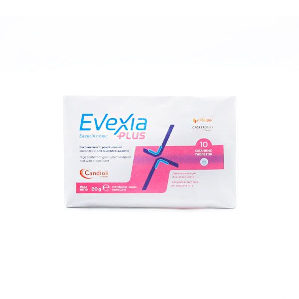 Знеболююче Candioli Evexia на основі конопляної олії (каннабідіол) для котів та собак.Показання для застосування:Знеболює без системного впливу на організмРекомендовано для боротьби з хронічним болем будь-якої етіології, у комплексній терапії для усунення післяопераційного болю та при онкології у тваринТакож для підтримки у всіх випадках, повязаних із хронічним болем, наприклад панкреатит, ідіопатичний цистит, кишкові захворювання, нейропатія, спричинена діабетом, ураження ЦНС та ПНР, раковий біль)Сприяє рухливості, зменшуючи клінічні ознаки остеоартритуНе має побічної дії або психотропного ефекту, оскільки містить лише каннабідіолМожна застосовувати у комплексі з іншими знеболюючими препаратами. Конопляна олія (гранульована) 14,0, мясні субпродукти, сахароза, пивні дріжджі, рослинні субпродукти, дріжджові продукти (ферментовані) (міталгол), дикальцій фосфат, магнію стеарат, моно- та дигліцериди жирних кислотСклад :Конопля ( 14,0, мясні субпродукти, сахароза, пивні дріжджі, рослинні субпродукти , дріжджові продукти (ферментовані) (міталгол), дикальцій фосфат, магнію стеарат, моно- та дигліцериди жирних кислот, етерифікованих органічними кислотами (гліцерил дибег переробки коноплі).Допоміжні речовини на 1 кг:Мікрокристалічна целюлоза Е460 585436 мг Гідроксипропіцелюлоза Е 463 819 мг Лецитин 33 809 мг. Сенсорні добавки: екстракт босвеллії (Boswellia serrata Roxb. Ех Colebr.): екстракт олібануму 34080 мг, імбирний олеорезин 2b489 3552 мг.Засоби проти злипання: колоїдний кремнезем Е551b 6767 мг. Антиоксиданти: альфа-токоферол lb307 25000 мг, аскорбінова кислота 3a300 15900 мг.Консервант: бутілгідрокситолуол (BHT) E321 100 мг. 1 таблетка містить: Конопляну олію 280 мг Босвелія 68 мг Імбір 7 мг.Переваги складу:Для певних неврологічних станів, таких як хронічний біль, вважається, що фітокомплекс Cannabis sativa, що складається з терпенів, флавоноїдів та фітоканнабіноїдів, є більш ефективним, ніж окрема молекула завдяки так званому ефекту оточення.Це синергічний ефект різних речовин, що містяться в цілому рослині.Каннабідіол - працює за шляхом болю у периферичних нейронах, спинному та головному мозку. І в імунних клітинах (макрофагах, небезпечних клітинах та гліальних клітинах, які відповідають за біль при запаленні).Casperome (Boswellia Phytosome) це високоочищений екстракт, отриманий з індійського ладану.Запобігає утворенню медіаторів запалення.Збільшує активність антиоксидантної системи.Стимулює периферичний кровообіг, зміцнює стінки судин. Забезпечує надходження крові до місця запалення.Міталголтм - комбінація двох екстрактів з доведеною протизапальною та знеболювальною дією.Екстракт імбиру лікарського це потужний антиоксидант та інгібітор ферментів запального процесу.У місці запалення знижує виділення медіаторів запалення та прозапальних цитокінів.Потужний анатолгоніст ванілоїдного рецептора TRPV1.Екстракт рослини акмелі: модулятор зниження запальних цитокінів шляхом активації рецепторів CВ інгібітор PGE та синтезу лейкотрієну потужний агоніст ванілоїдних рецепторів TRPV1 та TRPA1Спосіб застосування:Необхідно змішувати з їжею або давати тварині безпосередньо в рот відповідно до добової норми на вагу тварини:0-7,5 кг 0,5 таблетки7,5-15 кг 1 таблетка15-22,5 кг 1,5 таблетки22,5-30 кг 2 таблетки30-40 кг 2,5 таблетки40-60 кг 3 таблетки.10 крапель (0,5 мл) добавки на кожні 5 кілограм ваги тварини.Забезпечити вільний доступ до п