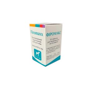 Фіромакс 80 мг для собак 10 - 16 кг, 20 табОписТаблетки круглої форми двоопуклі жовтувато-білого кольору.СкладПрепарат розроблений для собак з різною масою тіла кожна таблетка містить діючу речовину з розрахунку 5 мг фірококсибу на 1 кг маси тіла тварини.Допоміжні речовини: моногідрат лактози, мікрокристалічна целюлоза, стеарат кальцію, полівінілпіролідон, кукурудзяний крохмаль, колоїдний діоксид кремнію, порошок дріжджів.Фармакологічні властивостіATCvet QМ01АН90, нестероїдні протизапальні та протиревматичні засоби.ФІРОМАКС-нестероїдний протизапальний засіб на основі фірококсибу, що є селективним інгібітором ЦОГ-2 (циклооксигенази-2). Механізм дії фірококсибу полягає у вибірковому порушенні утворення простагландинів, що беруть участь у формуванні запальної реакції та пригніченні проліферативної та ексудативної фази запалення. Переважно діє у вогнищі запалення і дуже слабо впливає на продукцію простагландинів, що регулюють нирковий кровообіг і цілісність шлунково-кишкового тракту. Чинить протизапальну, аналгетичну та антипіретичну дії.Максимальна концентрація фірококсибу у плазмі крові собак досягається через 1,25 (0,85) години, біодоступність становить 36,9 (20,4) . Максимальна концентрація діючої речовини у плазмі крові становить 0,52 (0,22) мкгмл.період напіввиведення 7,59 (1,53) годин.Фірококсиб повністю звязується з білками крові, метаболізується в печінці і виводиться з жовчі через шлунково-кишковий тракт.ЗастосуванняДля зменшення запалення і болю при лікуванні собак при остеоартриті як протизапальний, болезаспокійливий і жарознижуючий засіб в періопераційний період (хірургічні втручання ортопедичні, Стоматологічні та на мяких тканинах).ДозуванняПрепарат застосовують собакам індивідуально одноразово перорально з кормом або примусово на корінь язика в мінімальній терапевтичній дозі: 5 мг фірококсибу на 1 кг маси тіла на добу одноразово.Залежно від маси тіла собаки фактична дозування становить:Маса тіла твариниКількість таблеток відповідного розміру на одне застосуванняЗміст фирококсиба5 10 кг1 таблетка50 мг10 16 кг1 таблетка80 мг16 25 кг1 таблетка125 мг25 45 кг1 таблетка225 мгДля собак з масою тіла більше 45 кг препарат можна дозувати за допомогою відповідної комбінації таблеток.Дотримання дієти або особливого режиму годування не потрібно. Розділення таблетки не допускається.Остеоартрит:Тривалість застосування препарату залежить від стану тварини і визначається ветеринарним лікарем.Тривале лікування (більше 90 днів) повинно проходити з обережністю і під постійним наглядом лікаря ветеринарної медицини.Хірургічні втручання:Для зменшення болю препарат застосовують за 2 години до початку операції. При необхідності лікування продовжують протягом 3 днів. Лікування собак після ортопедичного хірургічного втручання може тривати довше, що визначається ветеринарним лікарем.ПротипоказанняНе застосовувати тваринам з підвищеною чутливістю до діючої речовини або інших компонентів препаратуНе застосовувати вагітним і годуючим тваринамНе застосовувати собакам до 10 тижнів та або масою тіла менше 3 кгНе застосовувати тваринам з можливими кровотечами в травному каналі, при дискразії крові або геморагічних розладахНе застосовувати одночасно з іншими нестероїдними протизапальними препаратами або кортикостероїдамиЗастереженняПри за