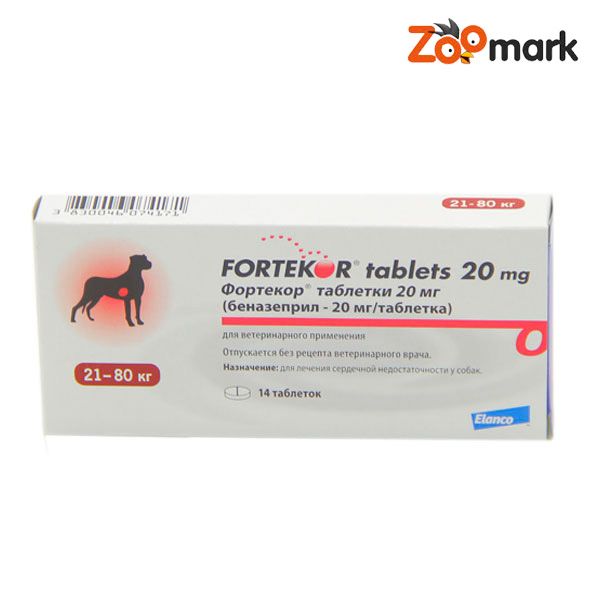 Опис препарату ФортекорФортекор таблетки призначають собакам для лікування серцевої недостатності.Фортекор таблетки випускають у двох видах: Фортекор таблетки 5 мг та Фортекор таблетки 20 мг. Фортекор таблетки 5 мг містить в якості діючої речовини беназеприл гідрохлорид - 5 мгтабл. а також допоміжні речовини: микрокристаллическую целюлозу - 19, кросповідон - 5, кремнію колоїдний ангідрид - 0,5, стеаринову кислоту - 3, сухі дріжджі і добавку зі смаком яловичини - 60. Фортекор таблетки 20 мг містить в якості діючої речовини беназеприл гідрохлорид - 20 мгтабл., а також допоміжні речовини: микрокристаллическую целюлозу - 2,93, кросповідон - 5, кремнію колоїдний ангідрид - 0,5, стеаринову кислоту - 3, сухі дріжджі і добавку зі смаком яловичини - 60. Випускають Фортекор таблетки у блістерах, упакованих у картонні коробки.Інструкція кФортекоруЛекарственний препарат застосовують індивідуально перорально, один раз на день у дозі 0,25-0,5 мг беназеприла гідрохлориду на 1 кг маси тварини. При необхідності разову дозу лікарського засобу можна збільшити вдвічі.Фортекор таблетки 5 мгФорекор таблетки 20мгМасса собаки, кгСтандартная доза, таблетокПовишенная доза, таблетокСтандартная доза, таблетокПовишенная доза, таблеток5-10121--11-2012--21-40--12141-80--12Продолжительность курсу лікування залежить від стану тварини і визначається лікуючим ветеринарним лікарем.Симптоми передозування у собак не встановлені.Слід уникати пропусків при введення чергової дози препарату, так як це може призвести до зниження терапевтичної ефективності. У разі пропуску однієї дози необхідно продовжити застосування препарату у тих же дозах за тією ж схемою.ПОБІЧНІ ДЕЙСТВИЯПри застосуванні Фортекора таблеток у відповідності з інструкцією по застосуванню побічних явищ та ускладнень, як правило, не відзначається.ПРОТИВОПОКАЗАНИЯПротивопоказанием до застосування Фортекора таблеток собакам є стеноз аорти, а також підвищена чутливість тварини до компонентів препарату. Не рекомендується застосовувати Фортекор вагітним і лактуючим сукам. При цьому застосування препарату можливе у тому випадку, якщо потенційна користь для тваринного перевищує можливий ризик для потомства, і проводиться під контролем лікуючого ветеринарного лікаря.При застосуванні Фортекора таблеток не рекомендується використовувати калійзберігаючі діуретичні засоби, блокатори кальцієвих каналів, препарати, що містять калій, нестероїдні протизапальні, седативні та інші препарати, що мають гіпотензивну дію. При необхідності одночасного застосування цих груп препаратів потрібно стежити за функціональним станом нирок, рівень калію в крові, звертати увагу на ознаки гіпотензії (слабкість, летаргія тощо).УМОВИ ХРАНЕНИЯХранят препарат в закритій упаковці виробника, окремо від продуктів харчування і кормів, в сухому, захищеному від світла місці, при температурі від 2С до 25С. Фортекор слід зберігати в недоступному для дітей місці.Термін придатності лікарського препарату при дотриманні умов зберігання 3 роки з дня виготовлення, після розтину упаковки (половинки таблеток) - не більше 48 годин. Забороняється використовувати Фортекор після закінчення терміну придатності.