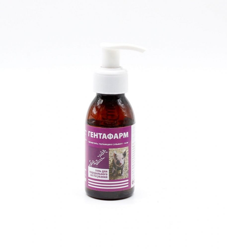 Прозорий безбарвний з опалесценцією гель. Склад 1 мл препарату містить діючу речовину: гентаміцину сульфат - 10 мг. Допоміжні речовини: динатрію едетат, натрію метабісульфіт, пропилметилцелюлоза, бензиловий спирт, гліцерин, вода для инекций. Фармакологічні властивості Гентаміцин належить до групи аміноглікозидів. Він звязується з 30S субодиницею рибосом і порушує синтез білка, перешкоджаючи утворенню комплексу транспортної та інформаційної РНК, при цьому відбувається помилкове зчитування генетичного коду і освіта нефункціональних білків. Має бактерицидну дію - у великих концентраціях знижує барєрні функції клітинних мембран і викликає загибель мікроорганізмів. Гентаміцин активний відносно грамнегативних та грампозитивних мікроорганізмів: Escherichia coli, Salmonella spp., Shigella spp., Enterobakter аегодепе, Klebsiella spp., деяких видів Proteus spp. і Serratia spp. Pseudomonas aeruginosa, Pasteurella multocida, Staphylococcus aureus, Serpulina hyodysenteriae Mycoplasmа spp. Резистентність мікроорганізмів до гентаміцину розвивається повільно, однак штами, стійкі до неоміцину і канаміцину, можуть проявляти стійкість також і до гентаміцину. Не діє на гриби, віруси, найпростіші. Дозировка Перорально один раз в сутки в дозах: поросята массой тела до 5 кг - 2 мл препарата (два нажатия на дозирующее устройство) поросята массой тела более 5 кг - 3-4 мл препарата (3-4 нажатия на дозирующее устройство). Для профилактики препарат задают однократно, для лечения - по показаниям в течение 2-3 суток. Препарат вприскивающие глубоко в ротовую полость животного. Однократное нажатие на дозирующее устройство обеспечивает дозу в 1 мл. Противопоказания Повишенная чувствительность к гентамицину. Не застосовувати одночасно з іншими аміноглікозидними антибіотиками і антибіотиками, які мають нефротоксичну дію (поліміксин В, колістин, хлорамфенікол, цефалоспорини), а також з міорелаксантами і анестезуючими засобами, сульфаніламідами, вітаміни групи В. Застереження Забій тварин на мясо дозволяється через 14 діб після останнього застосування препарату. Отримане, до зазначеного терміну мясо та молоко утилізують або згодовують непродуктивним тваринам, залежно від висновку лікаря ветеринарної медицини. Тривале лікування препаратом може призвести до нефротоксичної і ототоксичної дії. Форма випуску Пластикові флакони по 100 мл з дозаторами. Зберігання Сухе, темне, недоступне для дітей місце за температури від 5 до 25 С. Термін придатності - 2 роки, після першого відкриття флакона - 10 діб при зберіганні в темному місці при температурі від 5 до 15 С. Як купити Гентафарм гель 100млОформити замовлення через корзинуОформити замовлення по контактним телефонам