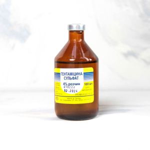 Гентаміцин - аміноглікозидний антибіотик, який діє бактерицидно на деякі грампозитивні та більшість грамнегативних бактерій, у тому числі: E. coli, Salmonella, Shigella, Enterobacter aerogenes, Klebsiella, деякі види Proteus і Sеrrаtіа, Pseudomonas aeruginosa, Pasteurella multocida, Staphylococcus aureus, Serpurlina (Treponema) hyodusenteriae, Mycoplasma spp.Препарат гальмує синтез білків у клітинах мікробів. Резистентність до нього розвивається повільно і дуже рідко.Через годину після внутрішньомязового введення гентаміцину настає максимальна концентрація препарату в сироватці крові.Терапевтична концентрація зберігається в організмі від 8 до 12 годин. Гентаміцин проникає у плевральну та черевну порожнини і через плаценту.В активному вигляді виводиться через нирки.Показання до використанняЛікування респіраторних і шлунково-кишкових інфекцій, сепсису, перитоніту, пієлонефриту, артритів, поліартритів, дерматитів (у собак) та інших захворювань тварин, що спричинені чутливими до гентаміцину мікроорганізмами.Спосіб застосування та дозиПрепарат вводять внутрішньомязово протягом 5-7 днів.ВРХ - 0,7 мл препарату (28 мг діючої речовини) на 10 кг живої ваги кожні 10 годинвівці, кози - 0,6-1,0 мл (24-40 мг діючої речовини) на 10 кг живої ваги кожні 8 годинконі, свині - 1 мл (40 мг діючої речовини) на 10 кг живої ваги кожні 6 годинсобаки, коти - 0,6 мл (24 мг діючої речовини) на 10 кг живої ваги кожні 6 - 8 годин.Новонародженим тваринам протягом перших днів життя застосовують 12 рекомендованої дози.ПротипоказанняУ чутливих тварин можливі алергічні реакції (шкірний висип, свербіж, лихоманка).Препарат чинить токсичний і нефротоксичний ефект.Тривале застосування препарату може спричинити порушення функцій восьмого мозкового нерва (собаки, коти), а також може пошкодити плід.ЗастереженняПорушення функції нирок, одночасне застосування з іншими нефротоксичними препаратами, одночасне застосування з міорелаксантами та деякими загальними анестетиками (халатон), гіперчутливість до гентаміцину.Вагітність. Гентаміцин не можна одночасно застосовувати з пеніцилінами, хлорамфеніколом, колістином, поліміксином, сульфаніламідами.Забій тварин на мясо дозволяється не раніше 21 дня після останнього введення препарату.Місце інєкції та нирки не використовуються в їжу протягом 45 днів.