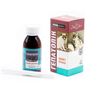 Суспензія від світло-коричневого до темно-коричневого кольору зі специфічним запахом складових.Состав1 мл препарату містить діючі речовини:есенціальні фосфоліпіди - 60 мг,метіонін - 100 мг,L-орнітин - 50 мг,екстракт розторопші плямистої - 15 мг,трави екстракт безсмертника - 15 мг. Допоміжні речовини: калію сорбат, натрію бензоат, ксантанова камедь, твін-80, пропіленгліколь, вода дистильована.Фармакологічні свойстваATСvet код QА05ВА. Комплексна функціональна кормова добавка для собак і котів при захворюваннях печінки.Гепатолик містить специфічні нутріцевтичні компоненти, які мають мембраностабілізуючі, гепатопротекторні, антиоксидантні властивості. Комплекс складових біологічно активних речовин покращує функціональний стан печінки і її дезінтоксикаційну функцію, сприяє збереженню та відновленню структури гепатоцитів, нормалізує рівень аміаку в організмі тварин, прискорює регенерацію клітин печінки.Основним компонентом кормової добавки є так звані есенціальні фосфоліпіди (EPL-субстанція), які являють собою високоочищенную фракцію фосфатидилхоліну. Визначальним компонентом цієї фракції є дилинолеоилфосфатидилхолин. Есенціальні фосфоліпіди за своєю хімічною структурою подібні до ендогенних мембранних фосфоліпідів, переважаючи їх за своїми функціональними властивостями за рахунок високого вмісту в них поліненасичених жирних кислот, особливо лінолевої кислоти. Фосфоліпіди є основними структурними елементами клітинних мембран і органел. Вони беруть участь у диференціації, поділі і регенерації клітин. Функціональне значення фосфоліпідів грунтується на їх амфіфільних властивостях, які дають змогу регулювати проникність клітинної оболонки. Вони покращують функцію мембран, зокрема іонний обмін, процес внутрішньоклітинного дихання, біологічне окислення, впливають на звязування ферментів внутрішньоклітинного дихання в мітохондріях, а також на процес окисного фосфорилювання в енергетичному обміні клітин. У фізіологічних умовах синтез фосфоліпідів задовольняє нормальні потреби гепатоцитів, які містять достатню кількість фосфоліпідів. Відомо, що структура клітинних мембран і функція ферментних систем при захворюваннях печінки порушуються. Порушується біосинтез фосфоліпідів, дефіцит яких призводить до порушення функції клітинної мембрани. Ці процеси особливо виражені у мітохондріях, які приблизно на 30 складаються з фосфоліпідів та у яких здійснюються найважливіші обмінні процеси, в тому числі окислювальне фосфорилювання. При дефіциті фосфоліпідів відбувається порушення жирового обміну, що призводить до жирової дистрофії печінки. Завдяки своїм фармакологічним властивостям Гепатолик усуває зазначені порушення, сприяє регенерації клітинних мембран, реактивує порушені мембранно-ферментні системи і рецептори, збільшує детоксикаційну здатність печінки і таким чином нормалізує її функцію.Силімарин виявляє гепатопротекторну дію завдяки конкурентній взаємодії з рецепторами до відповідних токсинів у гепатоцитной мембрані, виявляючи, таким чином, мембраностабілізуючу дію, стимулює синтез білків (структурних і функціональних) і фосфоліпідів в ушкоджених гепатоцитах, прискорюючи таким чином регенеративні процеси. Дія флавоноїдів, до яких належить силімарин, обумовлюється також їх антиоксидантні властивос