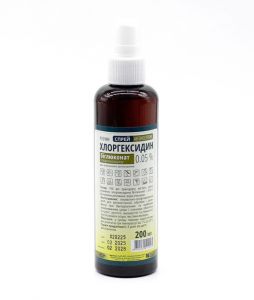 Спрей Хлоргексидина биглюконат 200 млХлоргексидина биглюконат 0,05 спрей 200 мл антисептический препарат для наружного применения, применяемий крупного рогатого скота, лошадям, свиньям, овцам, козам, кроликам, птице, собакам, кошкам для лечения инфекционних заболеваний, осложнений. рани, трещини, инфицированние ожоги, бактериальние и грибковие заболевания кожи, визванние микроорганизмами, чувствительними к хлоргексидин биглюконат.Прозрачний раствор со слабим специфическим запахом.Состав :100 мл препарата содержит действующее вещество:хлоргексидина биглюконат 20 0,35 г .Допоміжні речовини: вода очищена до 100 мл.Фармакологічні властивості:АТС-vet QD08 - антисептики та дезінфектантиQD08АС - хлоргексидинХлоргексидин біглюконат - антисептик, відноситься до похідних бігуанідів. Механізм його бактерицидної дії повязаний з порушенням рибосомальної РНК та здатністю змінювати властивості клітинної мембрани мікроорганізмів. Хлоргексидин біглюконат ефективний по відношенню до метицилінчутливих стафілококів (MSSA), а також метицилінстойких (MRSA) Staphylococcus aureus, Staphylococcus epidermidis, Staphylococcus valivarius. Препарат має високу активність щодо грампозитивних коків: Streptococcus viridans (Aerococcus viridans), Streptococcus haemolitycus, Streptococcus pneumoniae, Streptococcus mutans, Streptococcus agalactiae, Streptococcus serotypes і species. Серед грамнегативних бактерій найбільш чутливими до хлоргексидину біглюконату є: Escherichia coli, Haemophilus influenzae, Gardnerella vaginalis і Acinetobacter.Дозування:Наружно. 5-10 мл раствора наносят на пораженную поверхность кожи или слизистие мочеполових органов на 1-3 мин. 2-3 раза в сутки (на тампоне или орошение).Противопоказания:Не применять при дерматите, а также повишенной индивидуальной чувствительности к препарату.Не применять одновременно с другими антисептическими растворами.Предостережение:При попадании препарата на слизистую глаза необходимо бистро и тщательно промить ее водой.Форма випуска :Стеклянние иили полимерние флакони 200 мл.Хранение :Сухое темное место при температуре от 1 до 25 С.Хранить в недоступном для детей месте.Срок годности 3 года с дати изготовления.Срок годности после вскрития 7 суток.