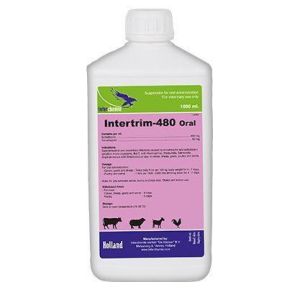 ОписСуспензiя бiлого кольору.Склад1 мл препарату містить діючі речовини:Триметоприм80 мгСульфадіазин натрію400 мгДопоміжні речовини: спирт бензиловий, вода дистильована.Фармакологічні властивостіИнтертрим - 480 Орал - комбинированний химиотерапевтический препарат с широким антимикробним спектром действия. Действующими веществами препарата являются cульфадиазин и триметоприм, которие в сочетании проявляют синергический еффект, в результате чего активность препарата значительно више, чем активность отдельно взятих компонентов.Сульфадиазин и триметоприм обладают бактерицидним действием по отношению к большинству грамположительних и грамотрицательних микроорганизмов, в том числе активние к большинству анаеробних бактерий. Препарат еффективен против грамположительних и грамотрицательних бактерий:E.coli, Haemophilus spp., Pasteurella spp., Salmonella spp., Stahylococcus spp., Streptococcus spp.и другие.Механизм действия заключается в последовательном угнетении ферментов, принимающих участие в синтезе фолиевой кислоти, тем самим, подавляя синтез тимидина бактериальной клетки. Сульфадиазин блокирует превращение парааминобензойной кислоти в дигидрофолиевую, триметоприм блокирует превращение дигидрофолиевой кислоти в терагидрофолиеву путем угнетения дигидрофолатредуктази.Рекомендації щодо застосуванняЛікування телят, козенят та ягнят (вiком до 8 тижнів), свиней та свійської птиці (кури-бройлери, ремонтний молодняк, індички, гуси, качки) при захворюваннях травного каналу, органів дихання та сечовивідних шляхів, що спричинені мікроорганізмами, чутливими до триметоприму та сульфадіазину, а саме:E. coli, Haemophilus spp., Pasteurella spp., Salmonella spp., Staphylococcus spp.таStreptococcus spp..Спосіб застосування та дозиПерорально з питною водою у дозах:свійська птиця (кури-бройлери, ремонтний молодняк, індички, гуси, качки) 1 л препарату на 1500-2500 л питної води щодобово протягом 47 дібсвині 1 л препарату на 1500-2500 л питної води щодобово протягом 47 дібтелята, козенята та ягнята (вiком до 8 тижнів) 5 мл препарату на 100 кг маси тіла двічі на добу протягом 47 діб.Перед застосуванням флакон необхідно ретельно струсити.Воду з препаратом потрібно змінювати кожні 24 годиниРозчин з препаратом має бути єдиним джерелом питної води під час лікування.ПротипоказанняПідвищена чутливість до триметоприму та сульфадіазину.Не призначати тваринам з порушенням функції нирок та печінки, а також при дискразії крові.Не застосовувати для курей-несучок, яйця яких застосовують в їжу людям.ЗастереженняЗабій тварин та свійської птиці на мясо дозволяється, відповідно, через 5 діб ( свійська птиця) та 8 діб (свині, телята, козенята, ягнята) після останнього застосування препарату. Отримане, до зазначеного терміну, мясо утилізують або згодовують непродуктивним тваринам, залежно від висновку лікаря ветеринарної медицини.Форма випускуПластикові флакони по 1000 мл.Умови зберіганняСухе, темне, недоступне для дітей місце при температурі від +15С до +25С.Після першого відбору з флакону, препарат необхідно використати протягом 14 діб, за умов зберігання в темному місці при температурі від +2С + 8СТермін придатності3 роки.