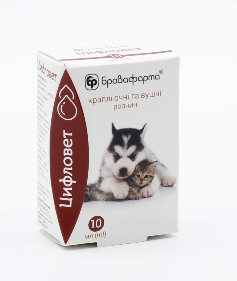 Цифловет краплі це антибактеріальний та протимікробний засіб для лікування інфекцій очей та вух у собак і котів. Препарат не містить дексаметазону, що робить його безпечним для тривалого використання. Призначений для місцевого застосування. Діє проти широкого спектру грампозитивних та грамнегативних бактерій, включно з Staphylococcus spp., Escherichia coli, Pseudomonas spp. та іншими патогенами.Спосіб застосуванняОчі: 12 краплі 23 рази на день на уражене око.Вуха: 35 крапель 12 рази на день, залежно від тяжкості інфекції.Перед застосуванням збовтати флакон. Використовувати стерильну піпетку або чисті руки для закапування.ПоказанняІнфекції очей (конюнктивіт, блефарит), інфекції зовнішнього слухового проходу (отит).ПротипоказанняПідвищена чутливість до компонентів препарату. Не застосовувати при серйозних травмах очей, які потребують хірургічного втручання.ЗберіганняЗберігати при температурі 525 C, у темному місці, у недоступному для дітей та тварин місці.