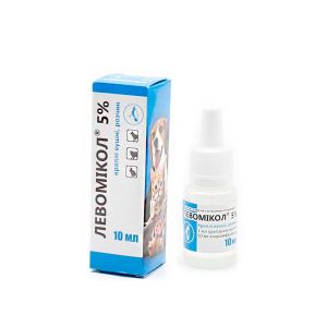 Прозора, злегка вязка рідина від безбарвного до світло-жовтого кольору.Склад 1 мл препарату містить діючу речовину: хлорамфенікол - 50 мг.Допоміжні речовини: диметилсульфоксид, спирт бензиловий, пропіленгліколь.Фармакологічні властивості :Хлорамфенікол - антибіотик, що володіє широким спектром антимікробної дії, активний відносно більшості грампозитивних і грамнегативних мікроорганізмів, таких як: St aphylococcus Aureus, Streptococcus pyogenes, Shigella spp., Brucella spp., Pasteurella tularensis, Escherichia coli, Proteus spp., Salmonella spp., Bacillus anthracis, Corynebacterium pyogenes, Erysipelothrix rhusiopathiae , а також рикетсій ( Rickettsia spp.) , мікоплазм ( Mycoplasma spp. ), хламідій ( Chlamydia spp. ). Дія хлорамфеніколу полягає в звязування з 50S рибосомальною субодиницею, що призводить до гальмування синтезу білка бактерій.Дозування:Закапувати тваринам масою тіла до 10 кг по 3-5 крапель, більше 10 кг по 7-8 крапель 2 рази на добу в хворе вухо, попередньо очищають від бруду, кірок, ексудату. Рекомендується закапувати препарат в обидва вуха (навіть у випадках запалення тільки одного). Курс лікування - 3-10 днів.Протипоказання:Підвищена чутливість до хлорамфеніколу.Застереження:Препарат несумісний з антибіотиками з групи хинолонив, а також з ристоміцином, пеніциліном.Гальмує протимікробну дію ,-лактамних антибіотиків.Форма випуску Флакони зі скла закриті гумовим корком під алюмінієву обкатку по 10 мл, вкладені в коробку разом з листівкою-вкладкою і кришкою-крапельницею.Зберігання:Сухе, темне, недоступне для дітей місце при температурі від 5 до 25 , С.Термін придатності - 3 роки. Після розкриття флакона препарат використати протягом 10 діб, за умови зберігання в темному місці при температурі від 5 до 25 , С.Як купити Левоміколь вушні краплі 10млОформити замовлення через корзинуОформити замовлення по контактним телефонам